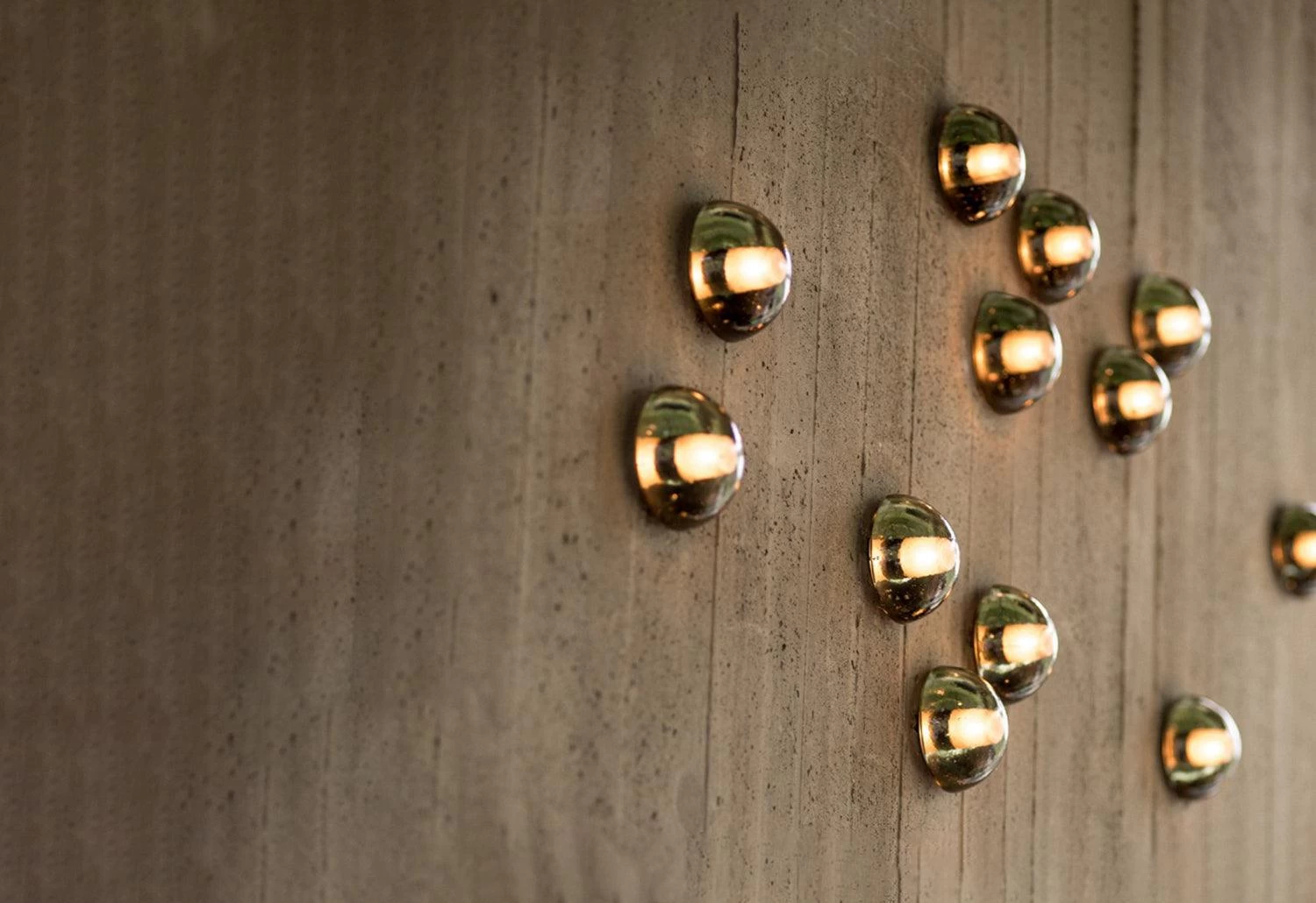 An articulated cast glass hemisphere with a frosted cylindrical void that houses a low voltage or LED lamp. The 14 series sconces are visually quite subtle. The light interacts with the imperfections, rifts, bruises and bubbles of the cast glass to make a rich halo of light.