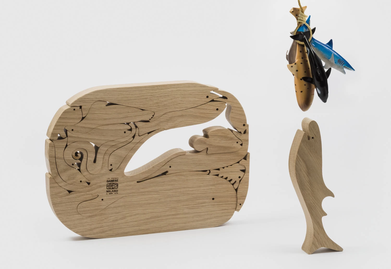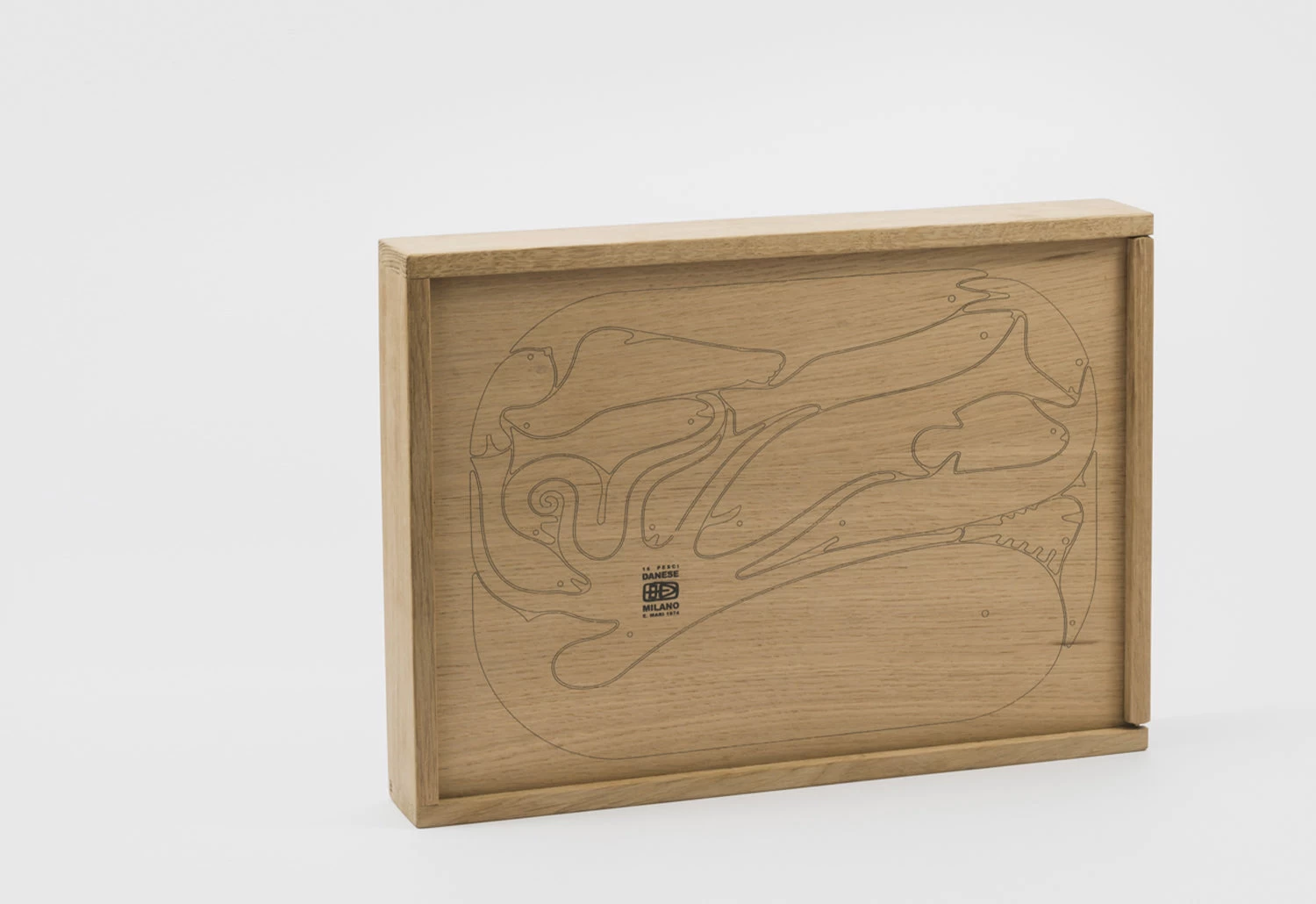 Pesci is a variant on Mari’s 16 Animali, first produced for Danese Milano in 1956. The Ani,ali puzzle marked the start of a long collaboration between Enzo Mari and Danese Milano. The modular puzzle became one of the best-known examples of educational design.