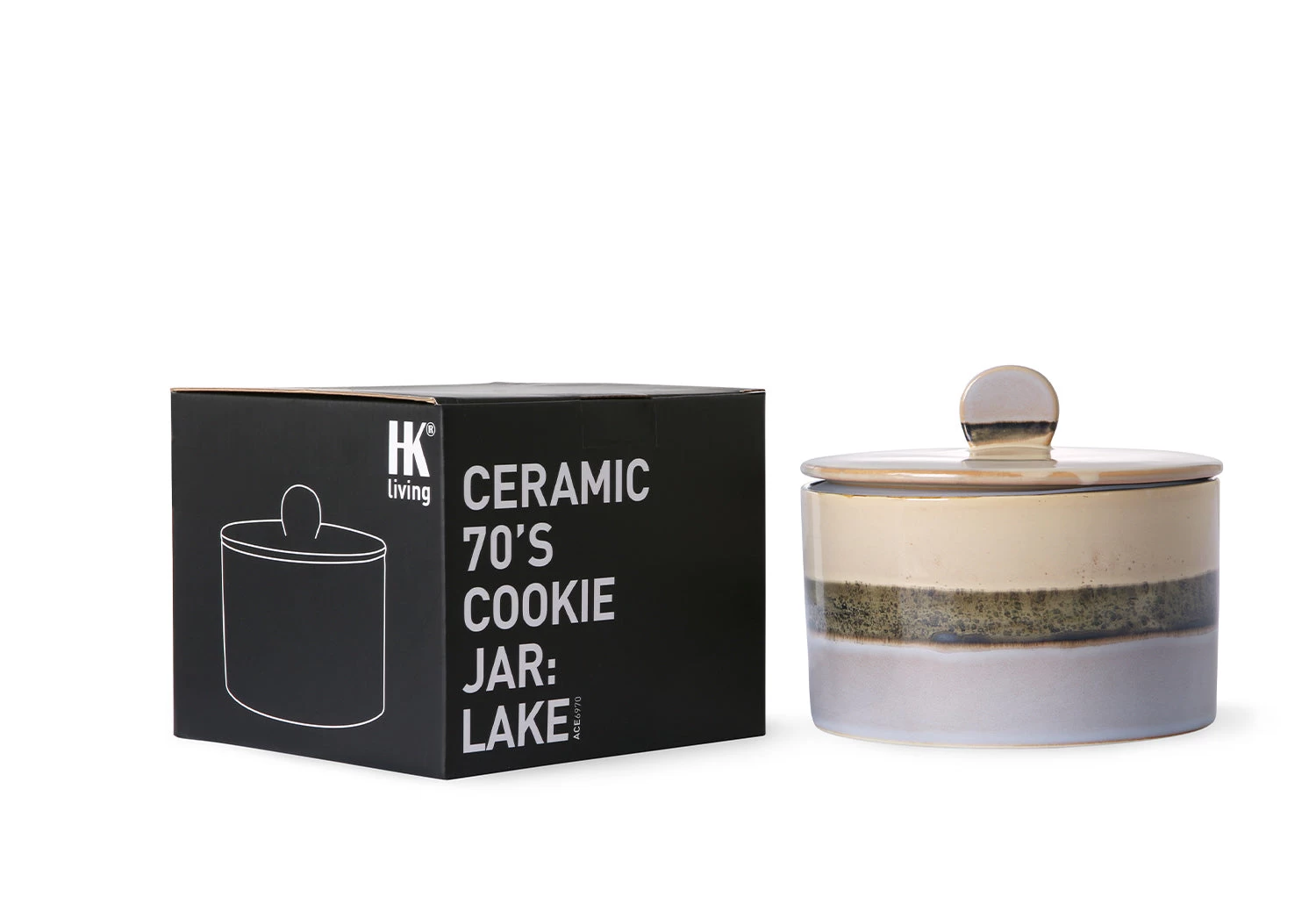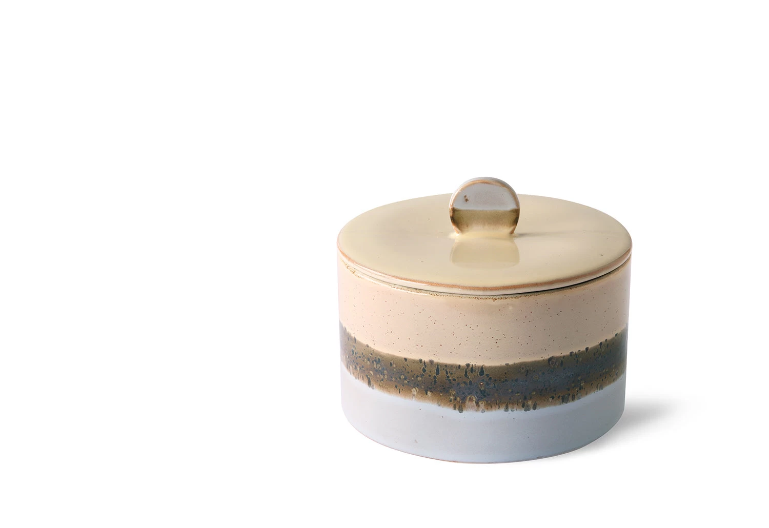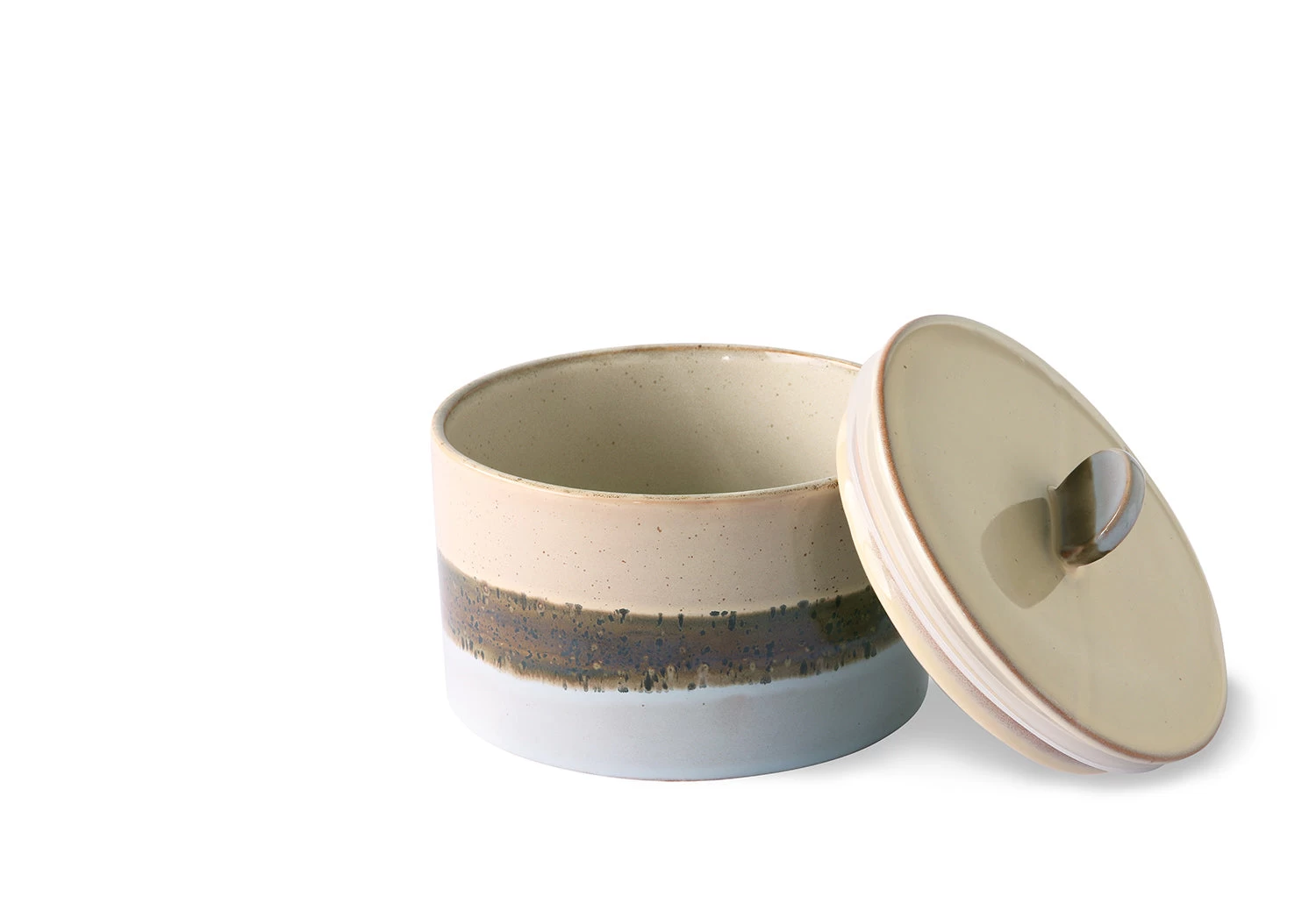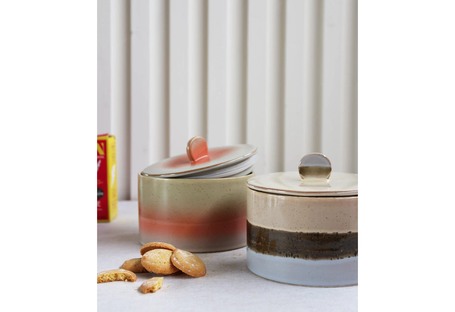 Adorned with three horizontal stripes in muted tones, the 70s cookie jar is both striking and functional. Complete with a flat lid with a large disc-shaped knob, this storage jar has plenty of space to keep your delicious delicacies and non-food trinkets safe.