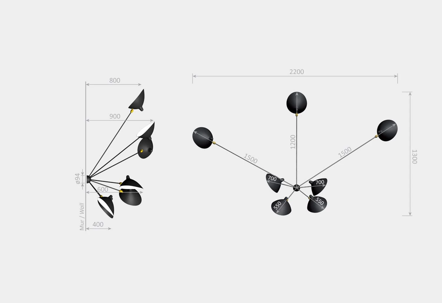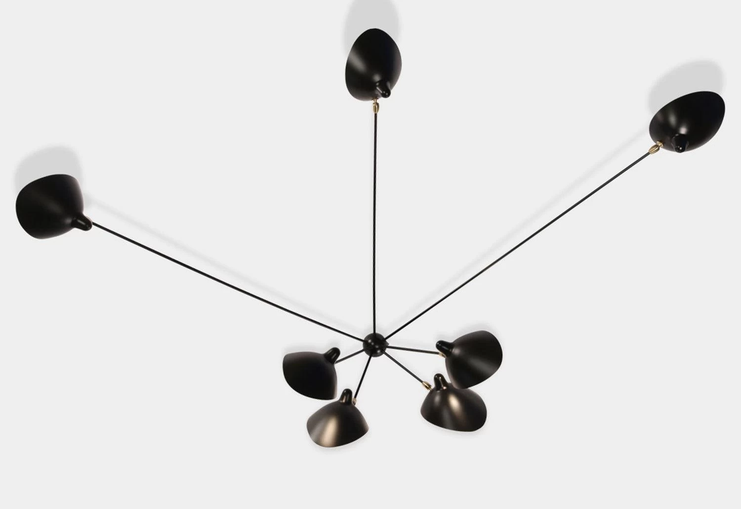 Featuring a spider-like design, the Araignee or the Spider ceiling/wall light features seven arms that extend from a fixed-length down rod assembly and varies in length, allowing light to be distributed throughout the room. The tiltable heads can articulate up and down in a 270° rotation and 55° inclination.