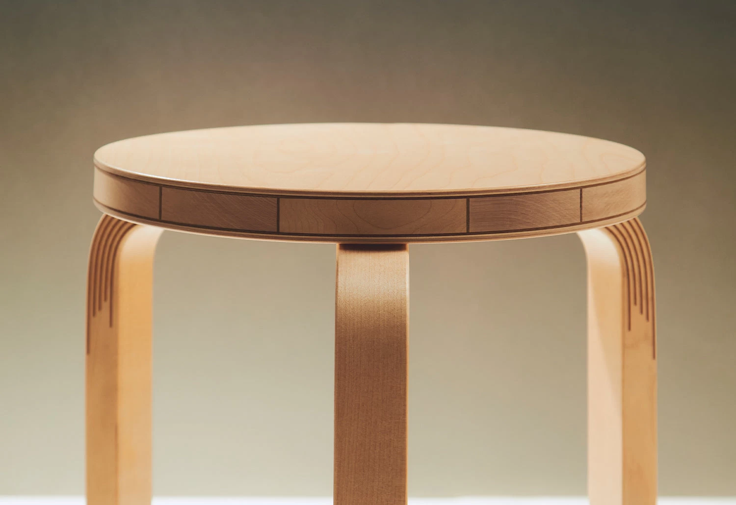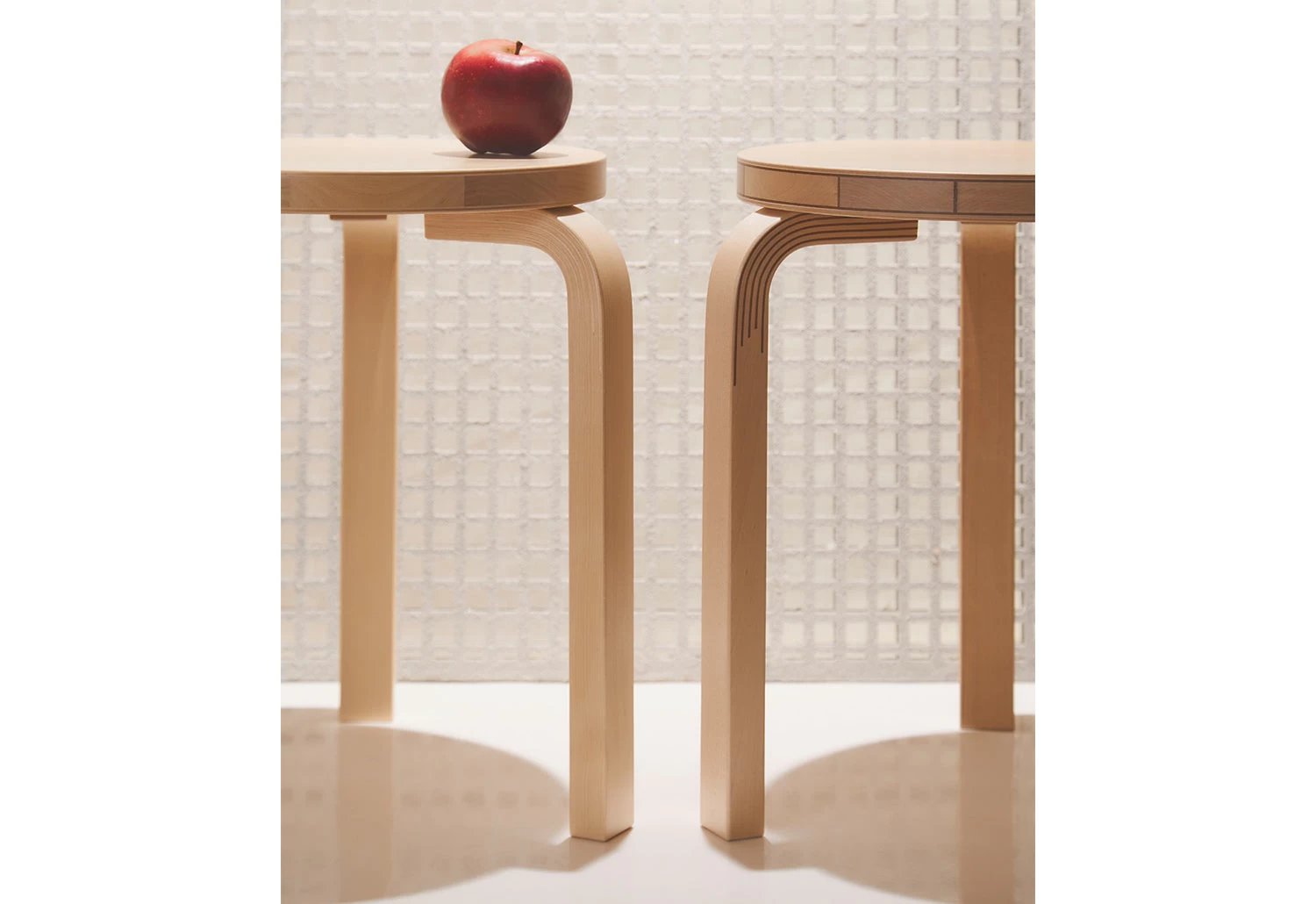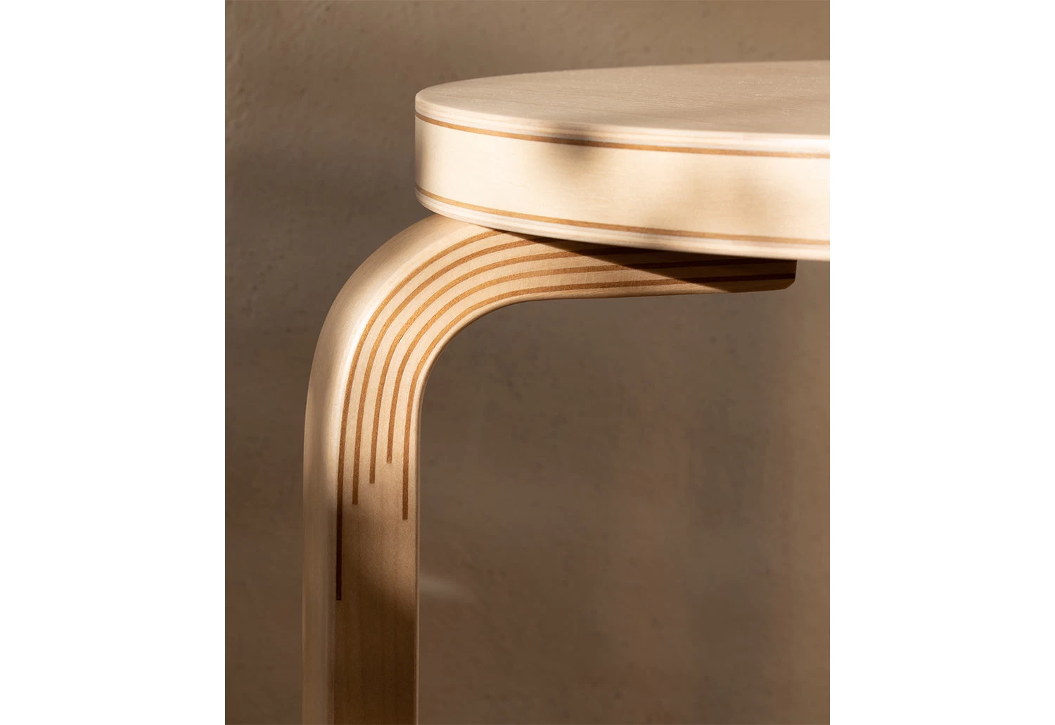 The Stool 60 Kontrasti Edition commemorates the 90 Years of Stool 60, celebrating its innovative construction. This special edition of the Stool 60 has been developed by Artek’s own design team, Kontrasti. The use of veneer sheets inserted into incisions in each leg of the birch wood provides the necessary flexibility to bend the wood into the desired L-shape. In the wood bending process, thermo-treated birch veneer in a contrasting tone is used to highlight the beauty of this great innovation.