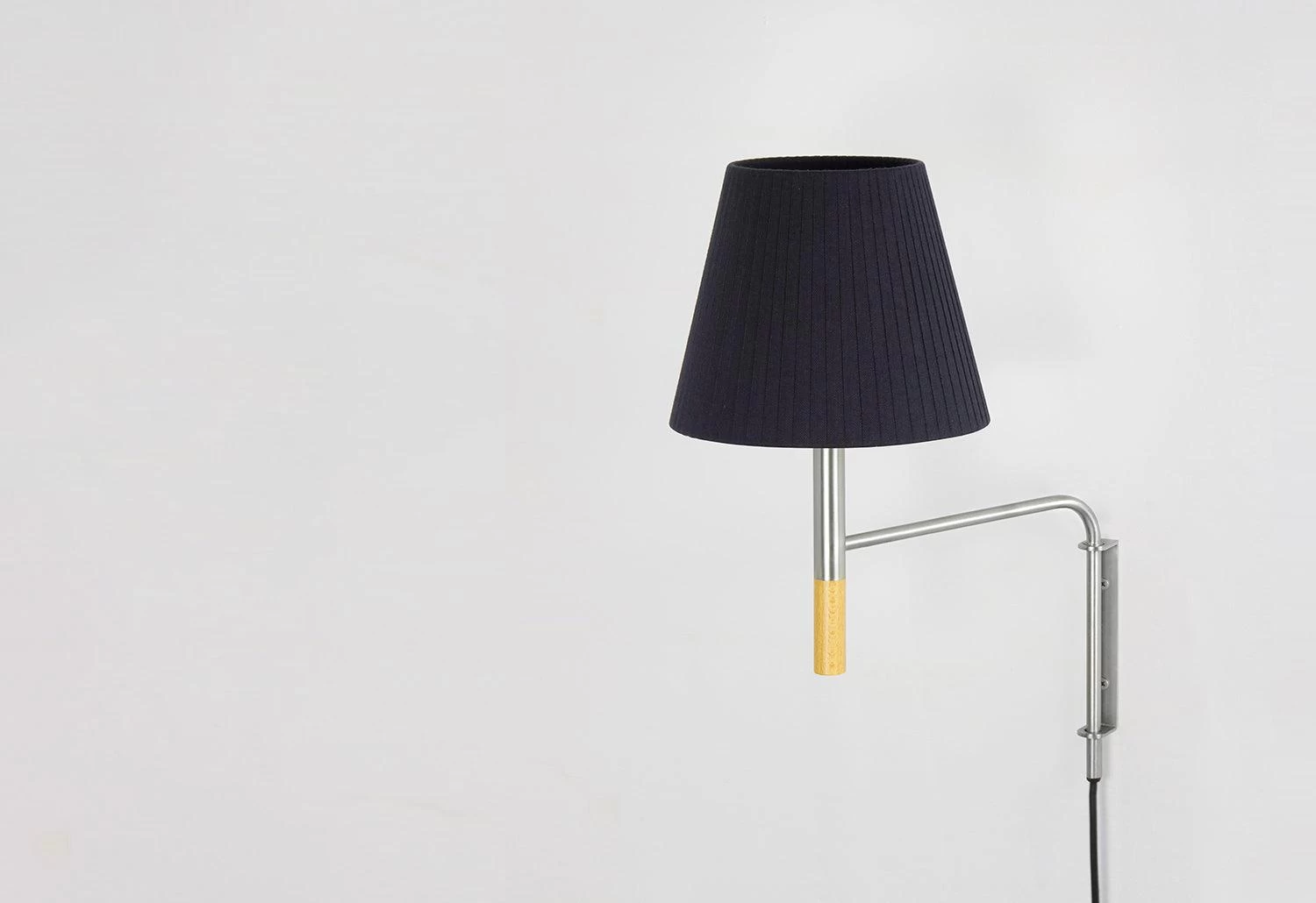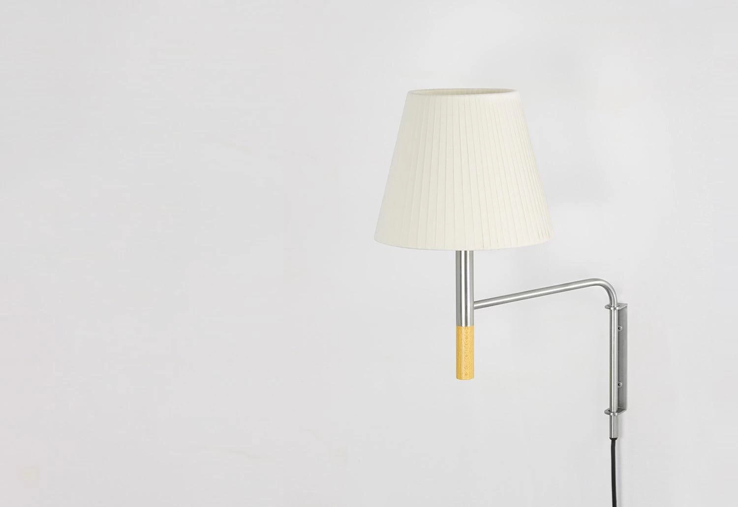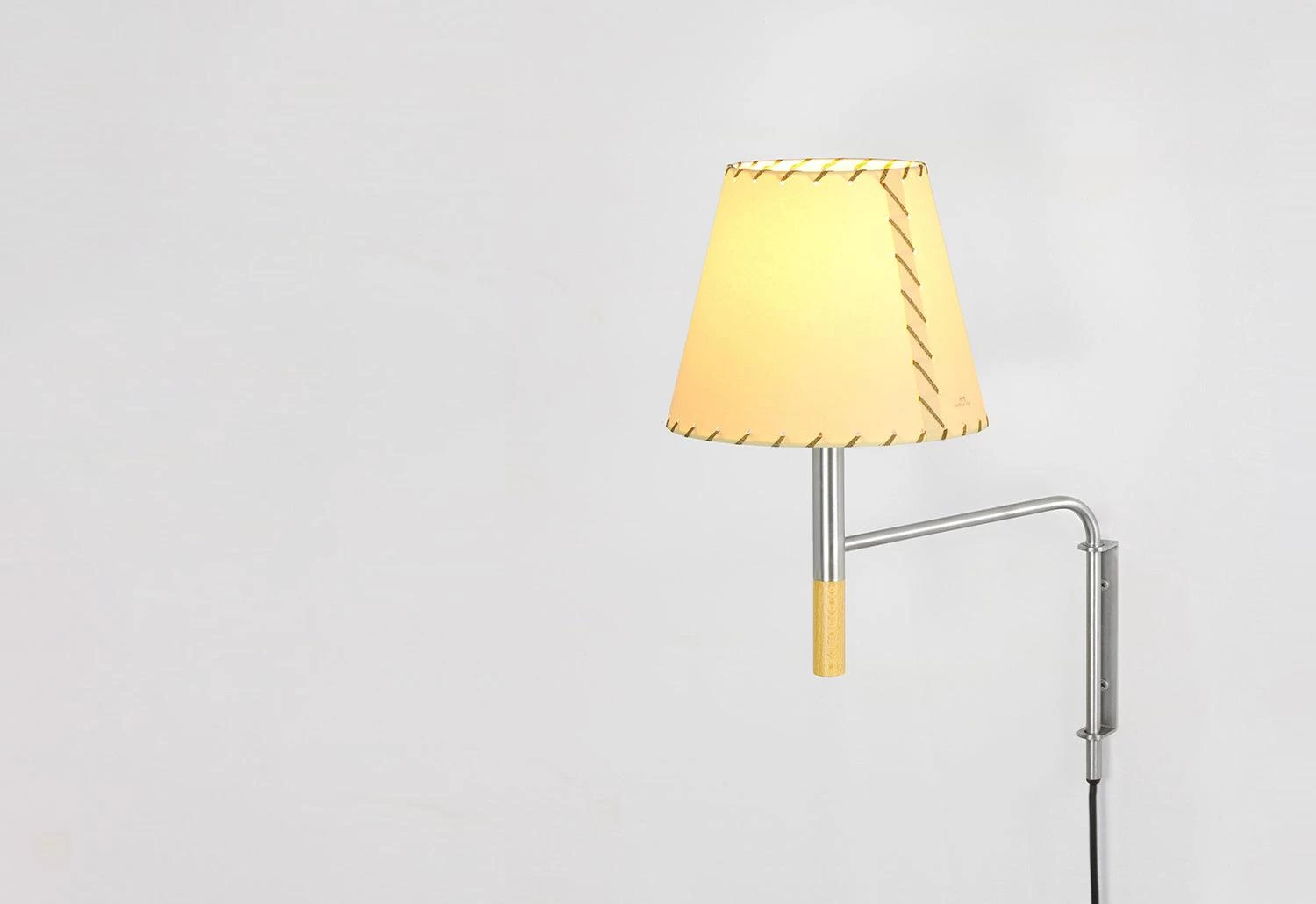 The BC1 wall lamp consists of a pivoting metal support arm mounted on a wall plate. The arm is fitted with an elbow joint and a practical wooden handle to position the shade as desired.