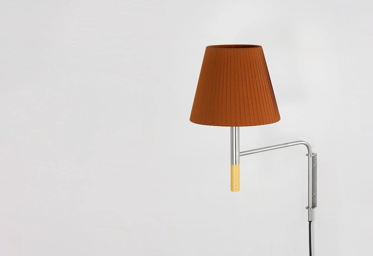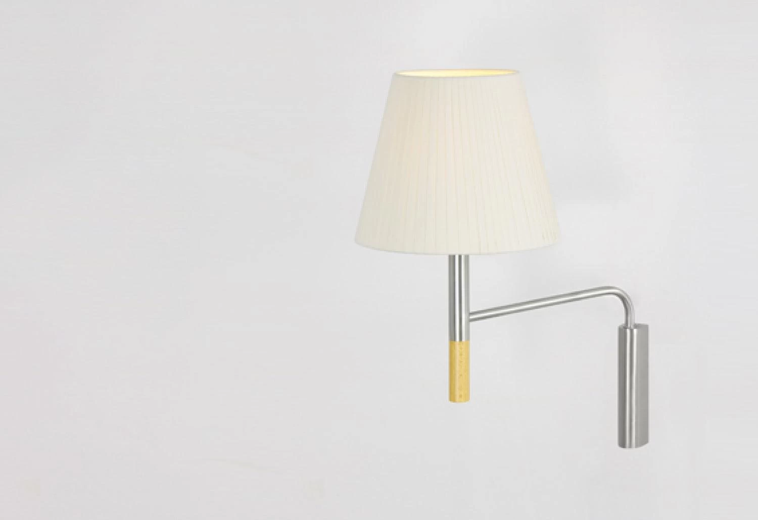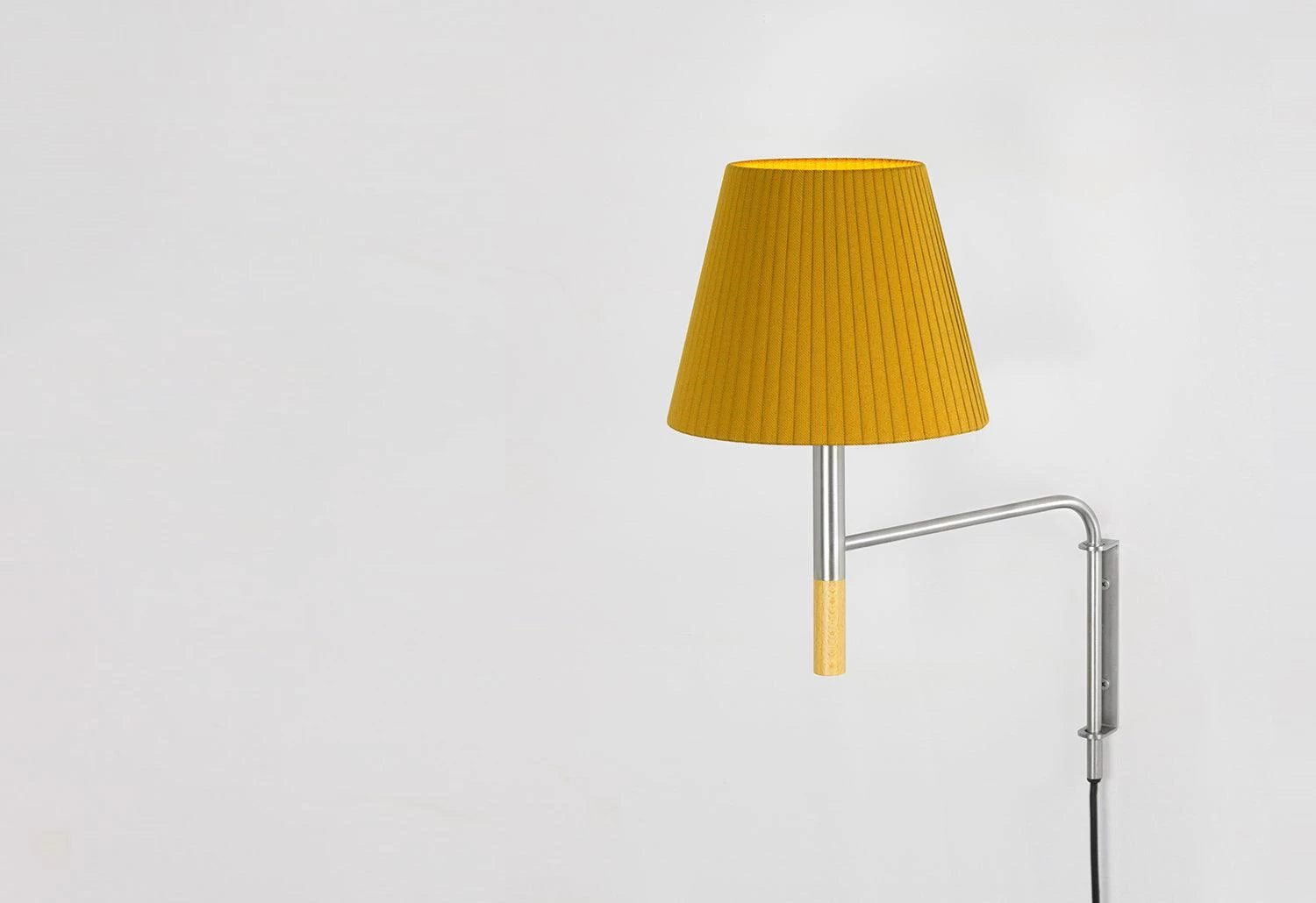 The BC1 wall lamp consists of a pivoting metal support arm mounted on a wall plate. The arm is fitted with an elbow joint and a practical wooden handle to position the shade as desired.