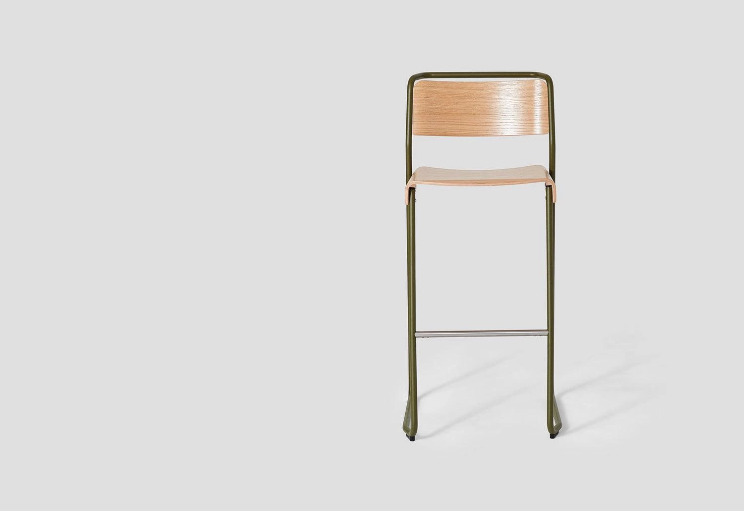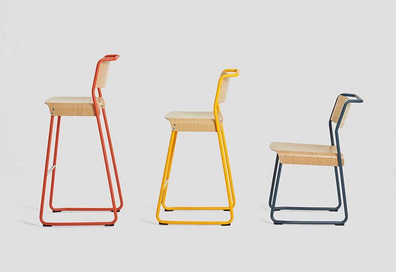 The design is inspired by the ubiquitous post-war school chair, with a steel frame married to a plywood seat and back. The resulting stool is highly functional, light-weight and stackable to four-high.