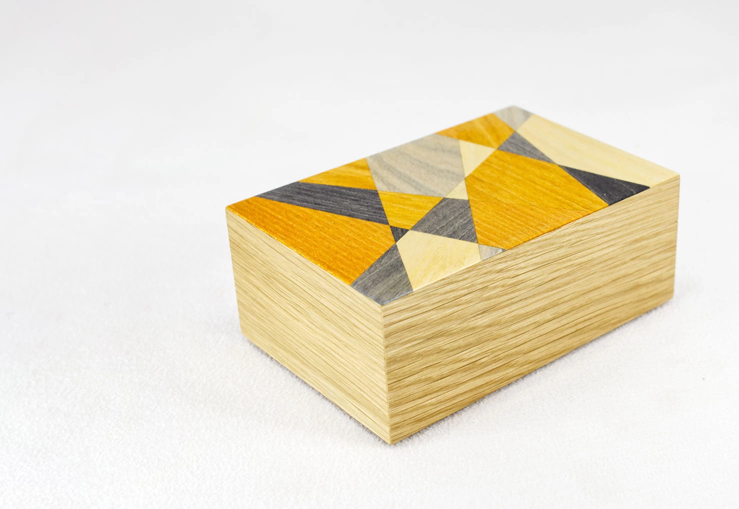 Featuring a graphic motif inspired by the cubist movement, Kevin Stampers Cubist Tray box is a wooden storage box ideal for storing jewellery or precious keepsakes.
