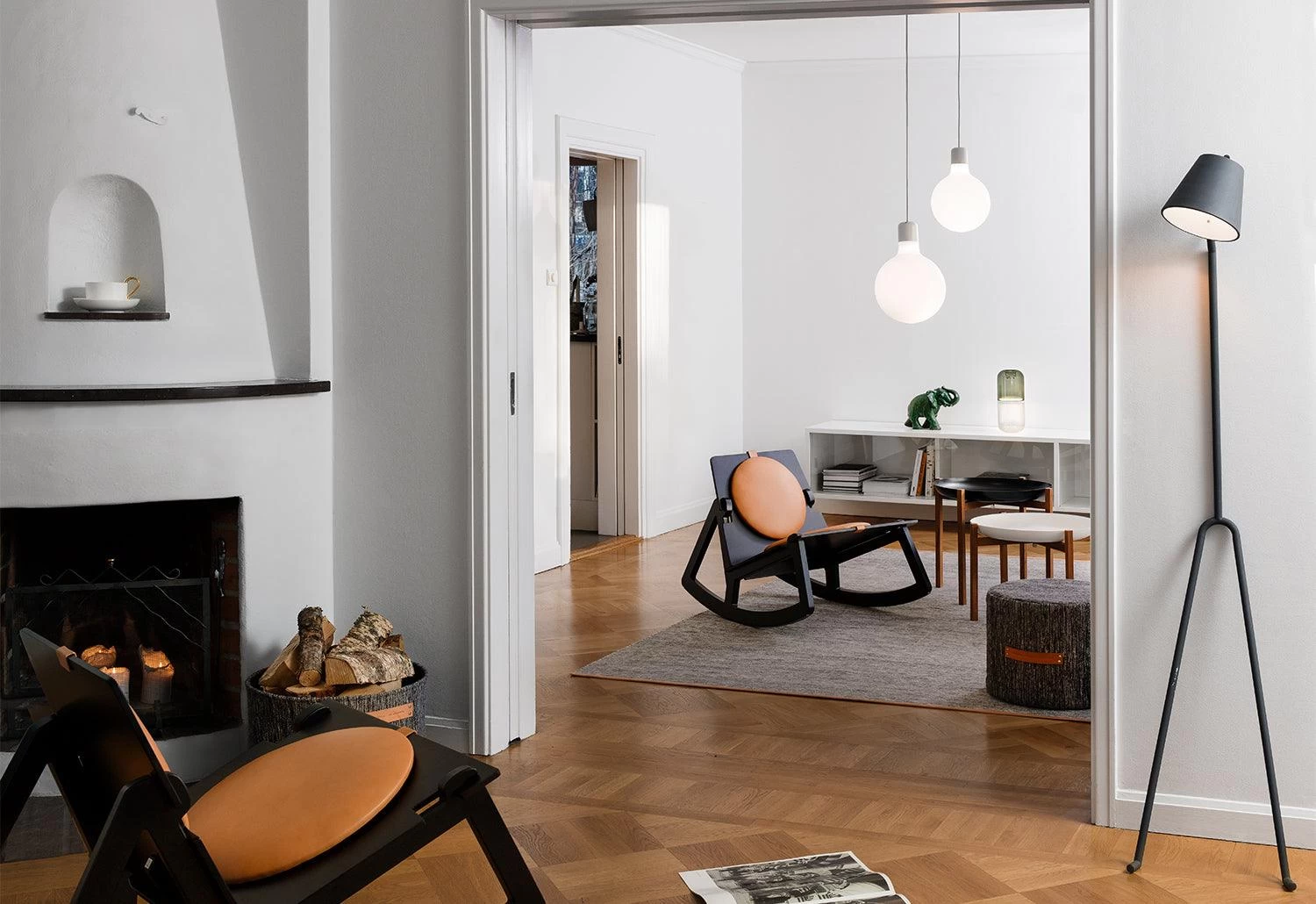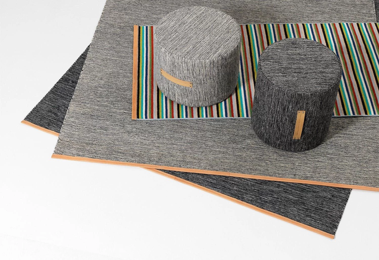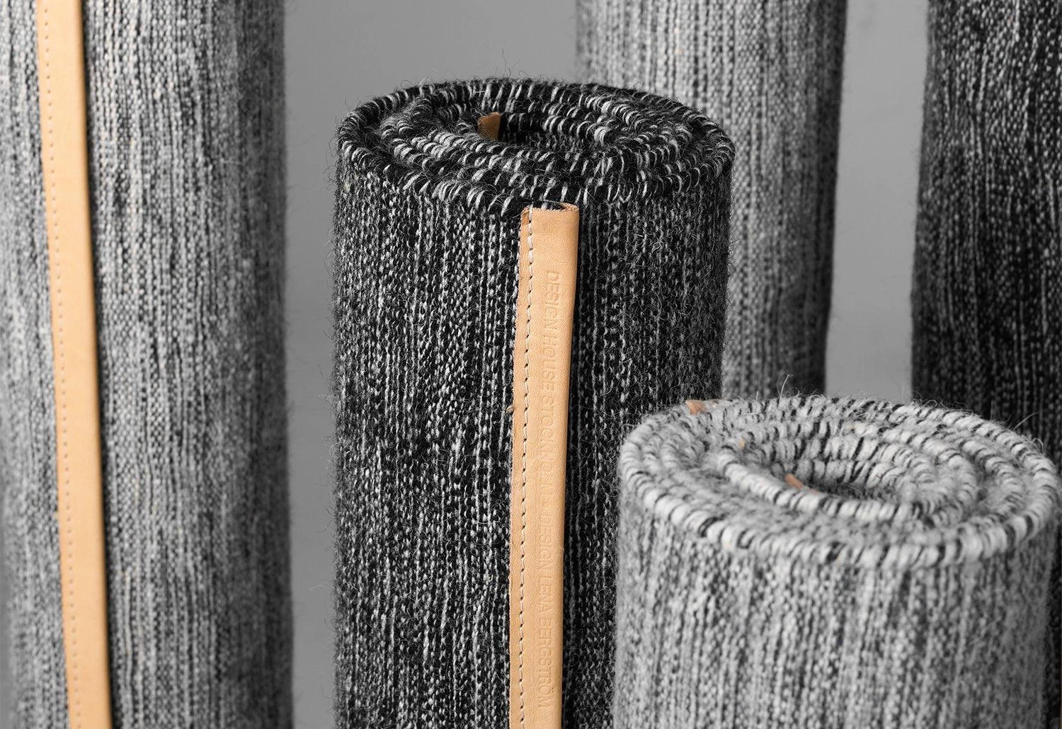 Inspired by the black and white trunk of the birch tree – ‘Björk’ in Swedish – Lena Bergstrom has created the Björk collection based on the shifting tones of wool combined with leather details. To achieve the marbled effect, different coloured wool yarns are intertwined in the weft.