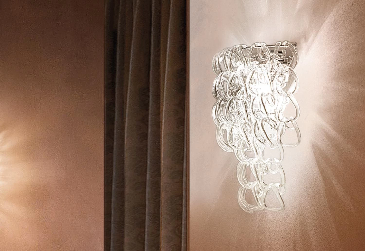 The Giogali family of lights comprises a range of dramatic shimmering forms created by individual handmade crystal elements which are curved in their form to allow them to hook over a metal frame.