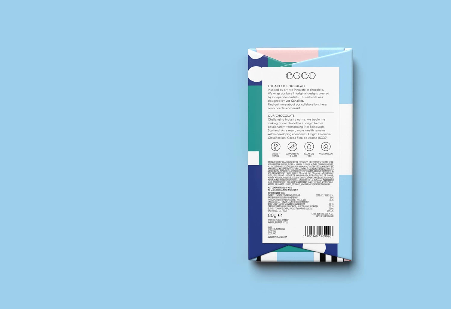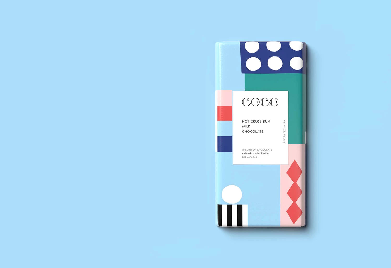 The chocolate bar is wrapped in a print designed by Les Canailles, a duo of Paris-based French artists Diane Marissal and Jérémie Leblanc-Barbedienne.