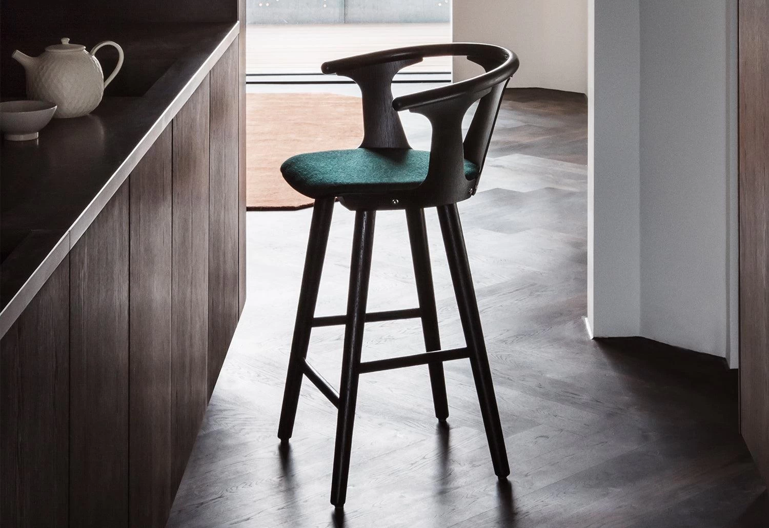 Like its sister chair, the In Between stool adopts two traditional techniques in its manufacture. The form pressed seat and the rear frame is made from compression moulded veneer for lightness and strength, whilst the solid wood back support and legs are turned on a lathe for greater detail. The result is a well-balanced expression and a chair that embraces both the sitter and modern design.