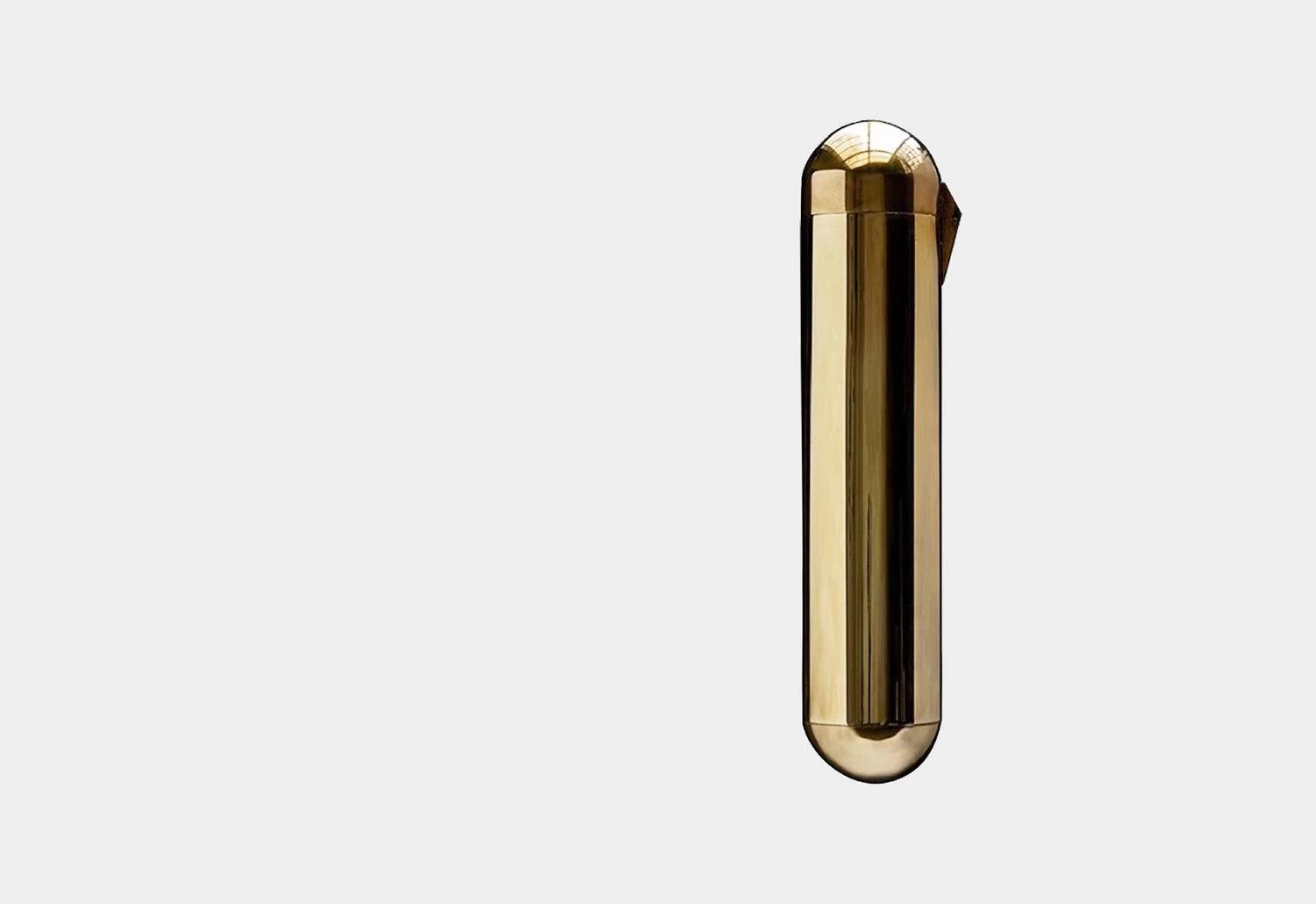 A translucent rod containing an LED light source glides from its brass enclosure, the intensity of the light determined by how much of the rod is revealed.