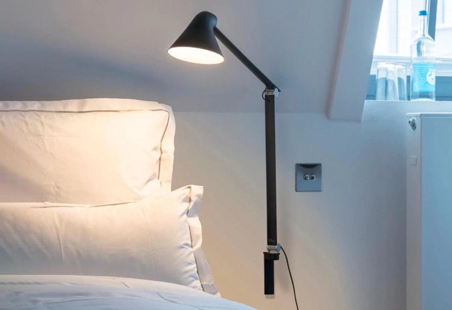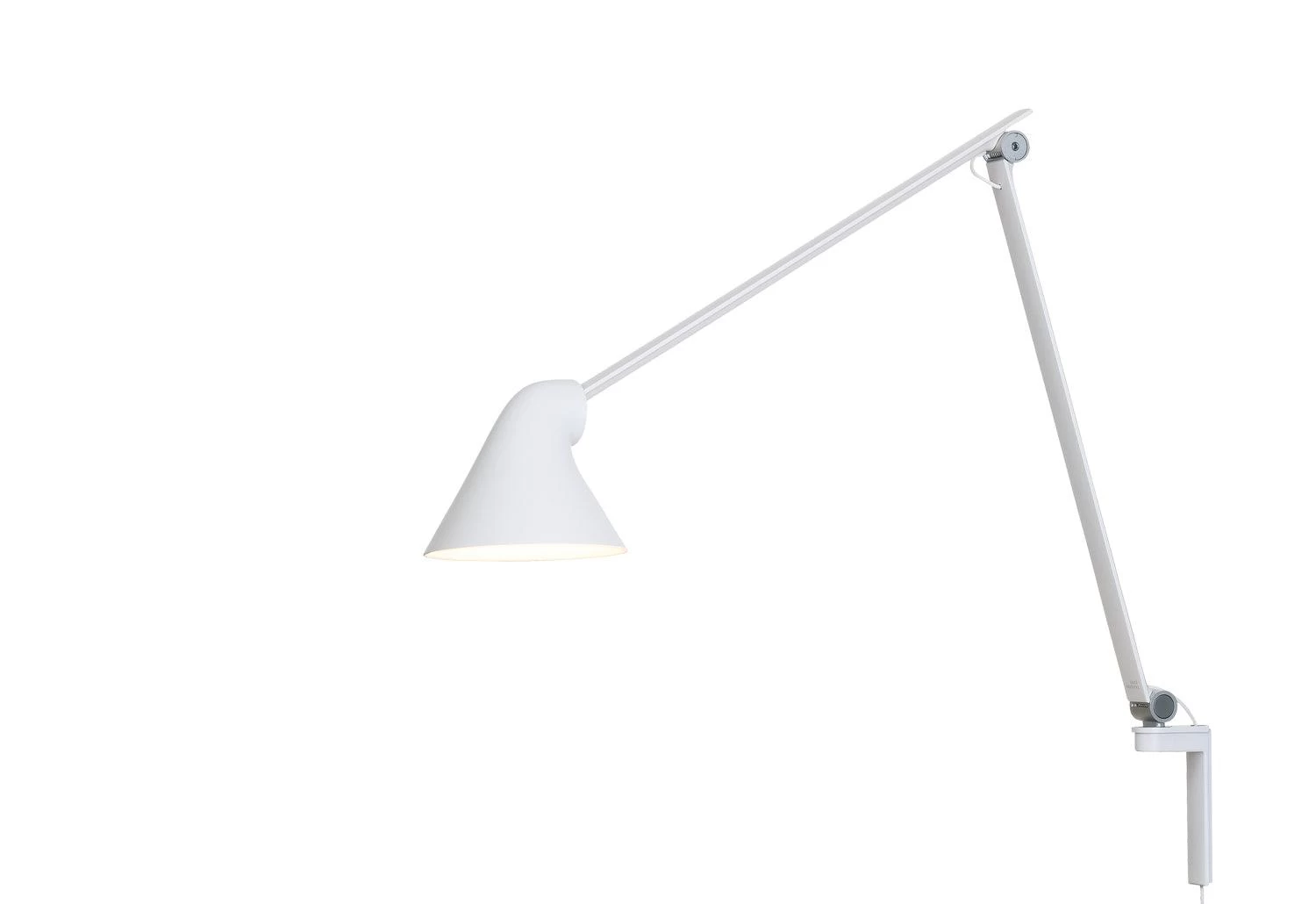The NJP wall lamp provides direct glare-free horizontal light while reflecting some of the light through the rear of the head, illuminating the top of the arm. The ergonomic design of the fixture head shapes the light and gives optimal light direction. A simple mechanical system provides great freedom of movement, so the light can always be set in the ideal position in the workspace. The shade is painted white on the inside, reflecting comfortable diffused light.