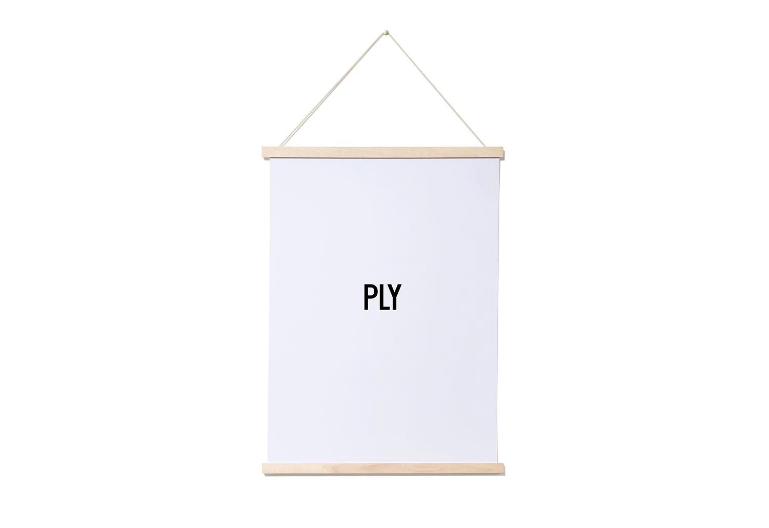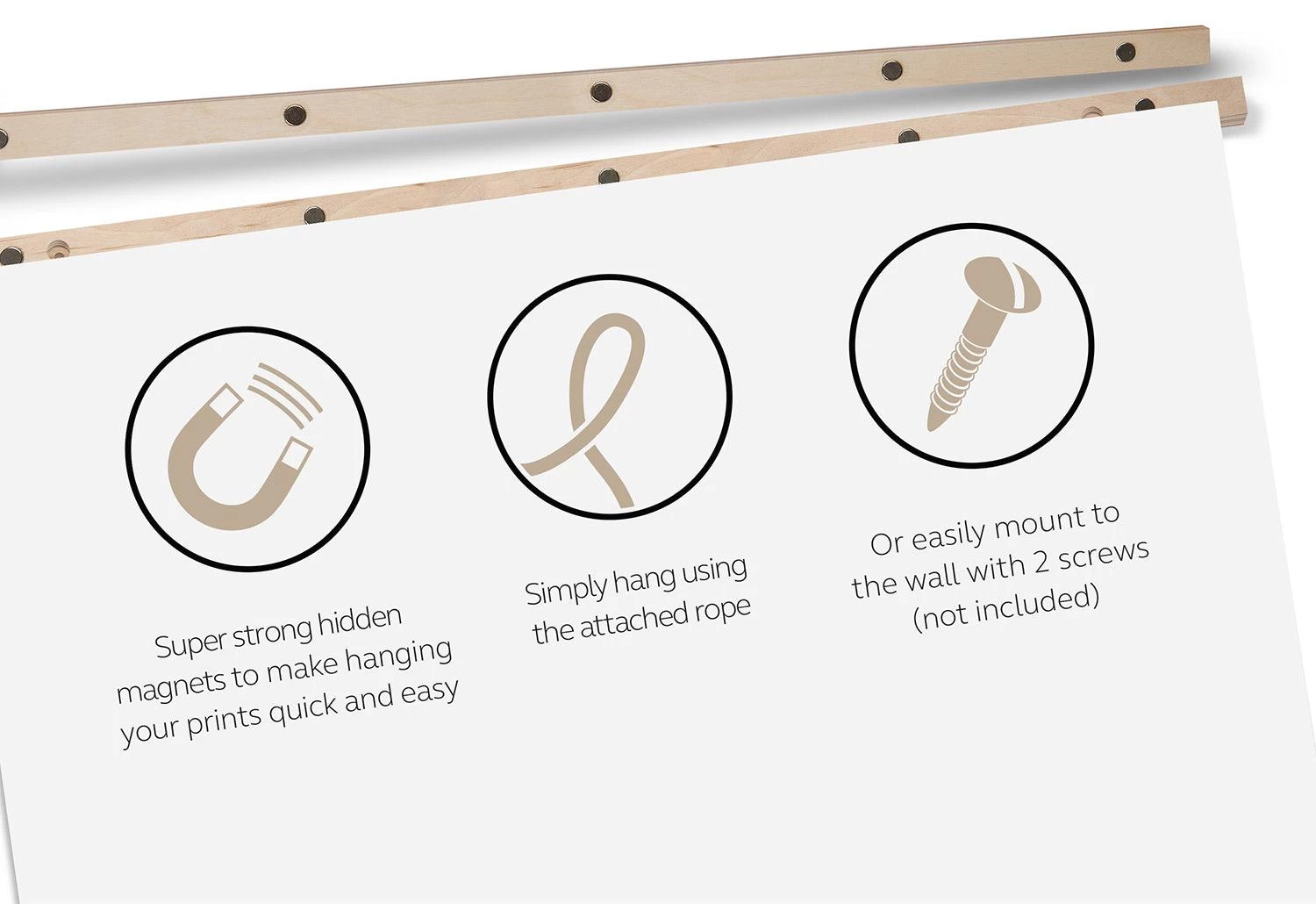 Each hanger set consists of a pair of plywood strips which can be attached to the top and the bottom of the paper you wish to hang. High-strength magnets set into the wood hold the wooden strips in place. Once joined together, the plywood pieces have a seamless square profile.