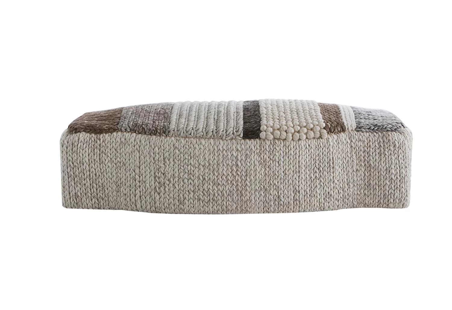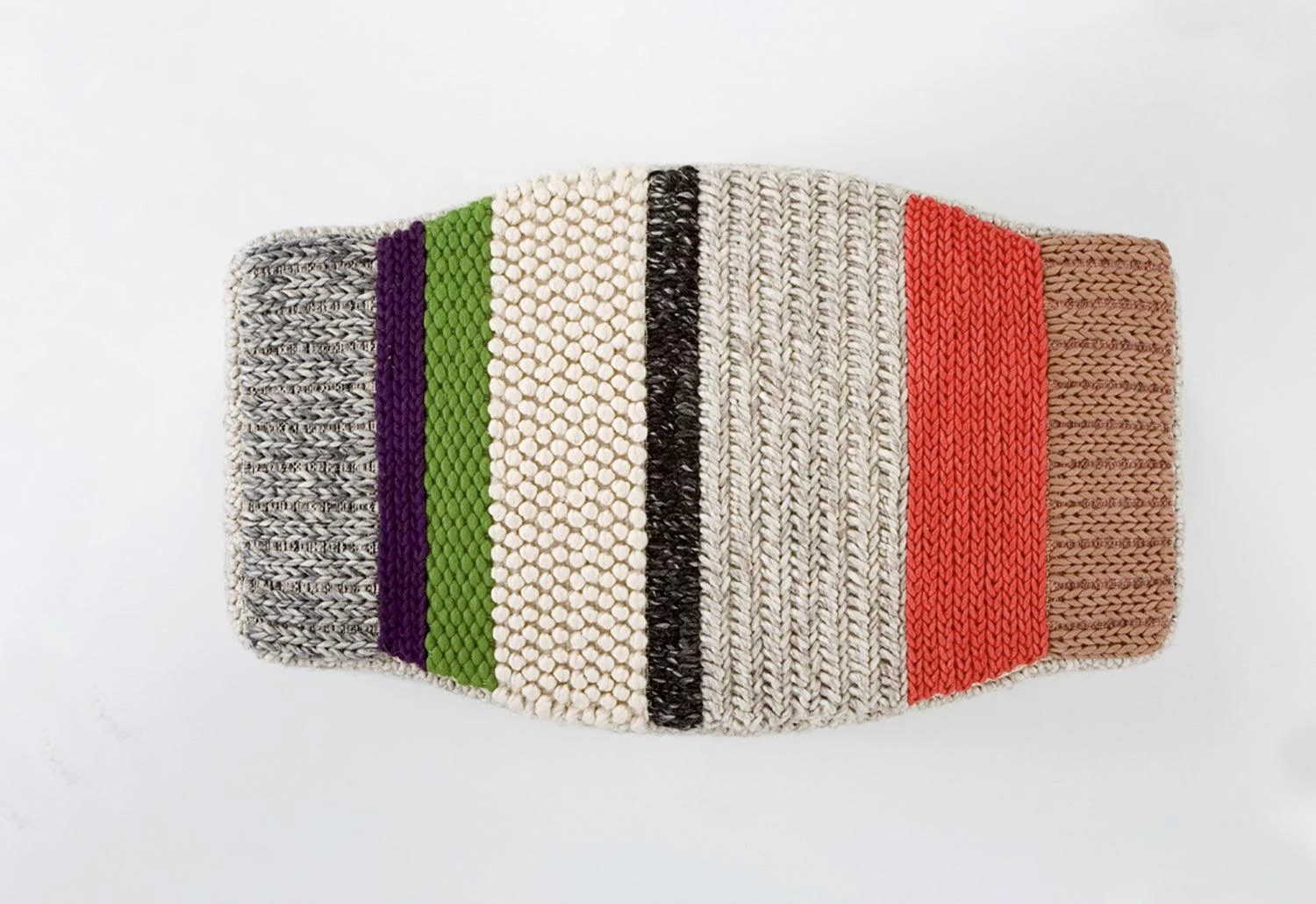 Pouf with a wool cover, the design based on a patchwork of different wool knits. Three different shapes available, to combine as ‘sleeves’ (Mangas) or to work as freestanding elements. Available in two colourways.