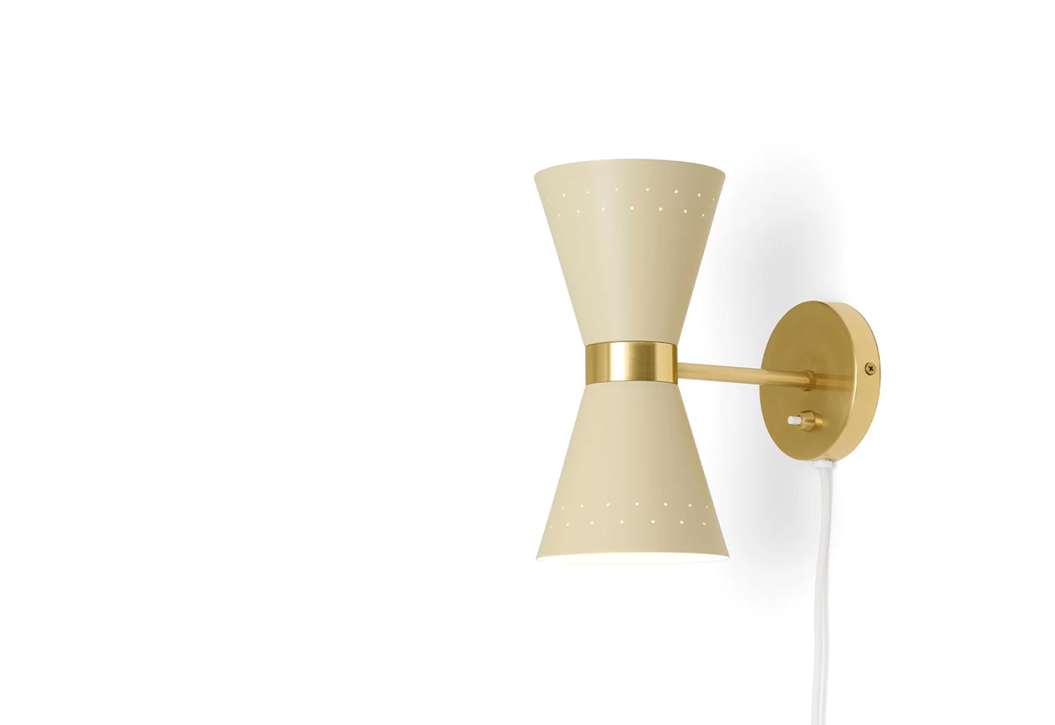 One of three lights in the collection, the wall-mounted lamp comes with a solid brass band that holds a conical metal shade which projects the light in two directions. The tiny perforations in the shade allow the light to seep through, providing subtle ambient lighting.