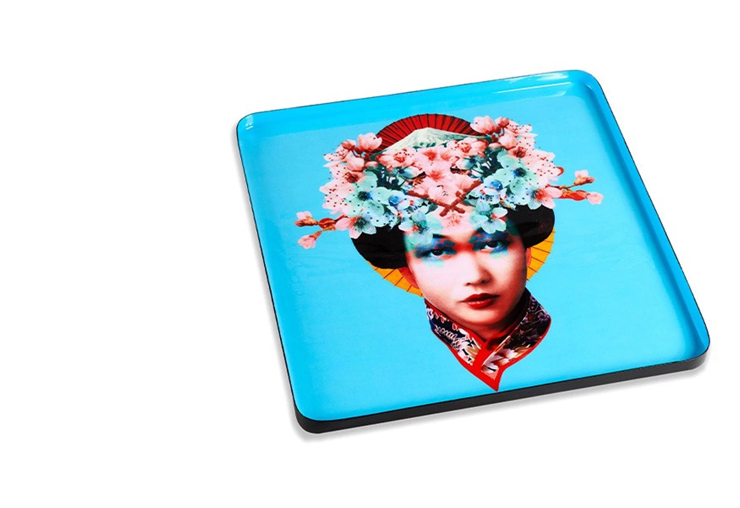 The Miss Fuji square tray fuses three Japanese icons; a Geisha, Mount Fuji and a flourish of cherry blossoms against a vibrant sky-blue background.