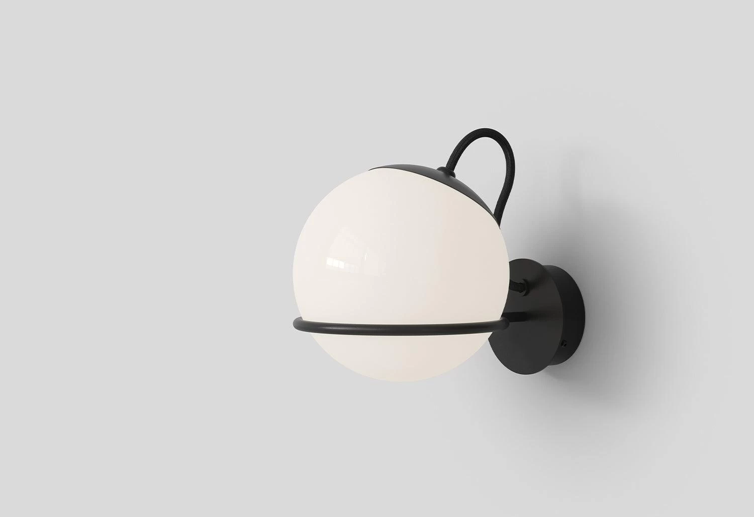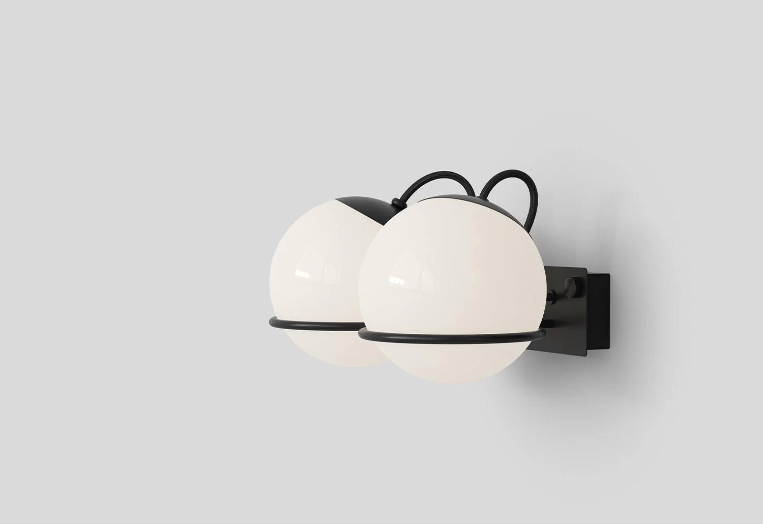 Similar to the Model 238 wall lights, the Model 237/1 features a single blown opaline glass sphere lightly upheld by a Black or Champagne painted steel ring. Model 237/2 features two blown opaline glass spheres gently held in place by two Black, or Champagne, painted steel rings. The spheres can be placed facing downward or upward and thus providing a direct or indirect light composition. Â