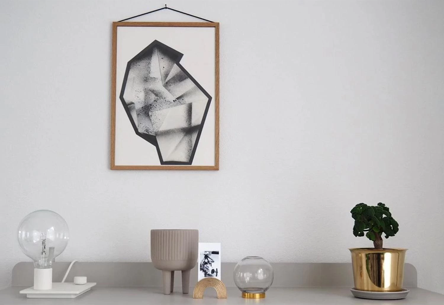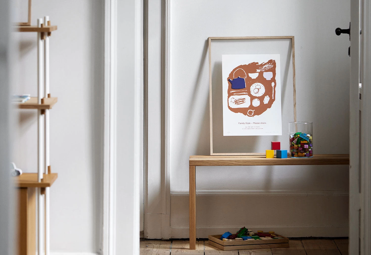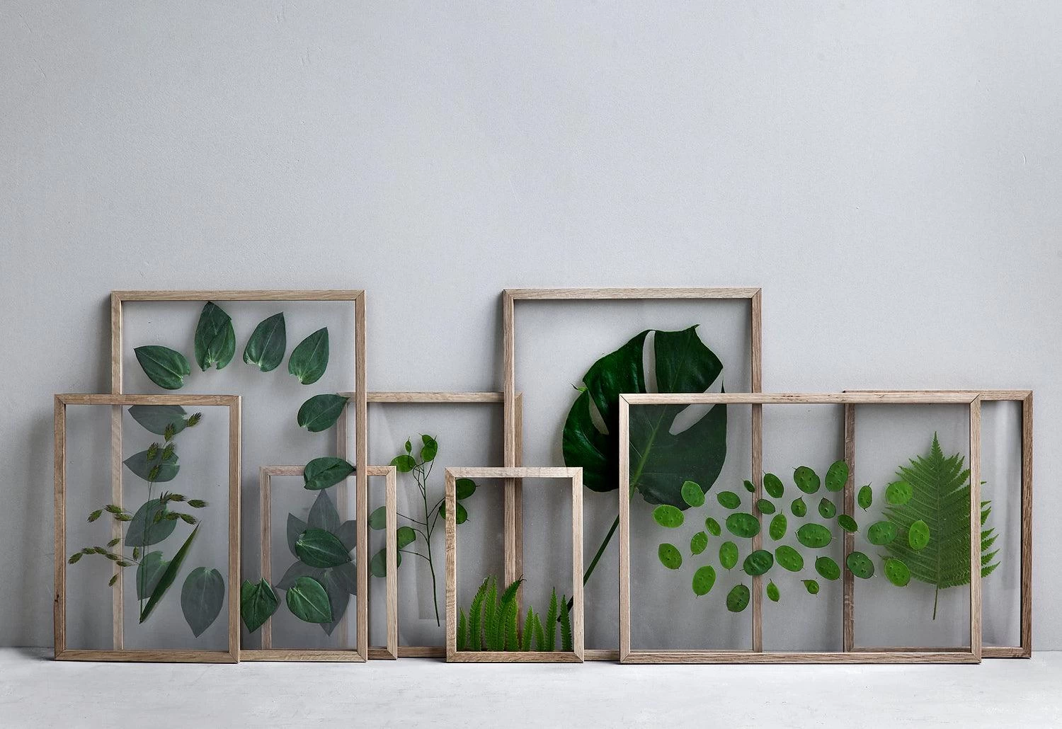 Consisting of only the essential elements, the paired down MOEBE frame simply slots together. Four pieces of oak wood hold two pieces of plexiglass in place with a rubber band to create a minimal frame. Frame special prints or press ephemera in the double-sided design.