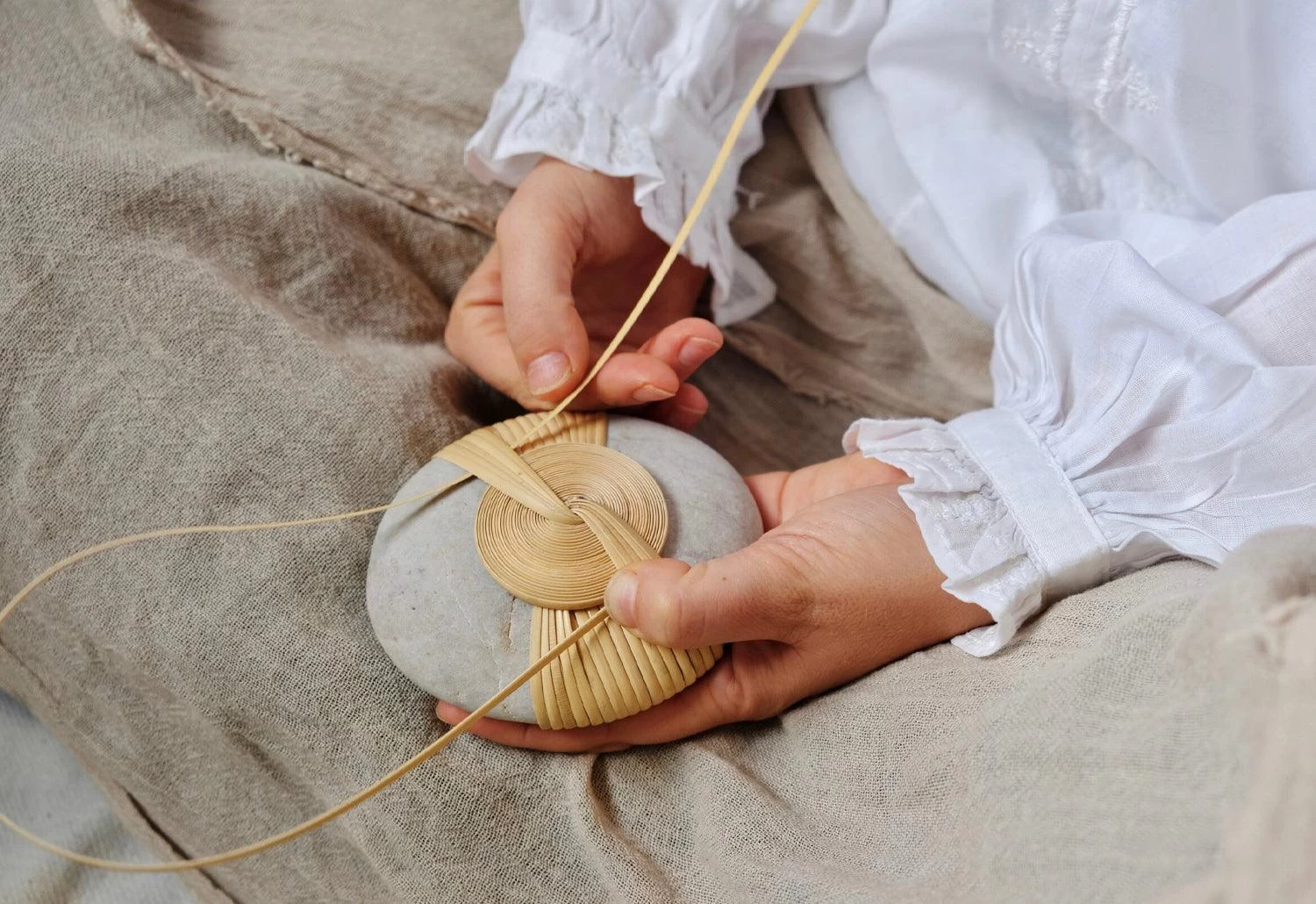 Utilising an ancient ornamental knot technique, Felicity Hall creates intuitive woven patterns on thoughtfully chosen stones. The process is deeply meditative, with Hall taking their time to connect with each stone as a living part of nature.