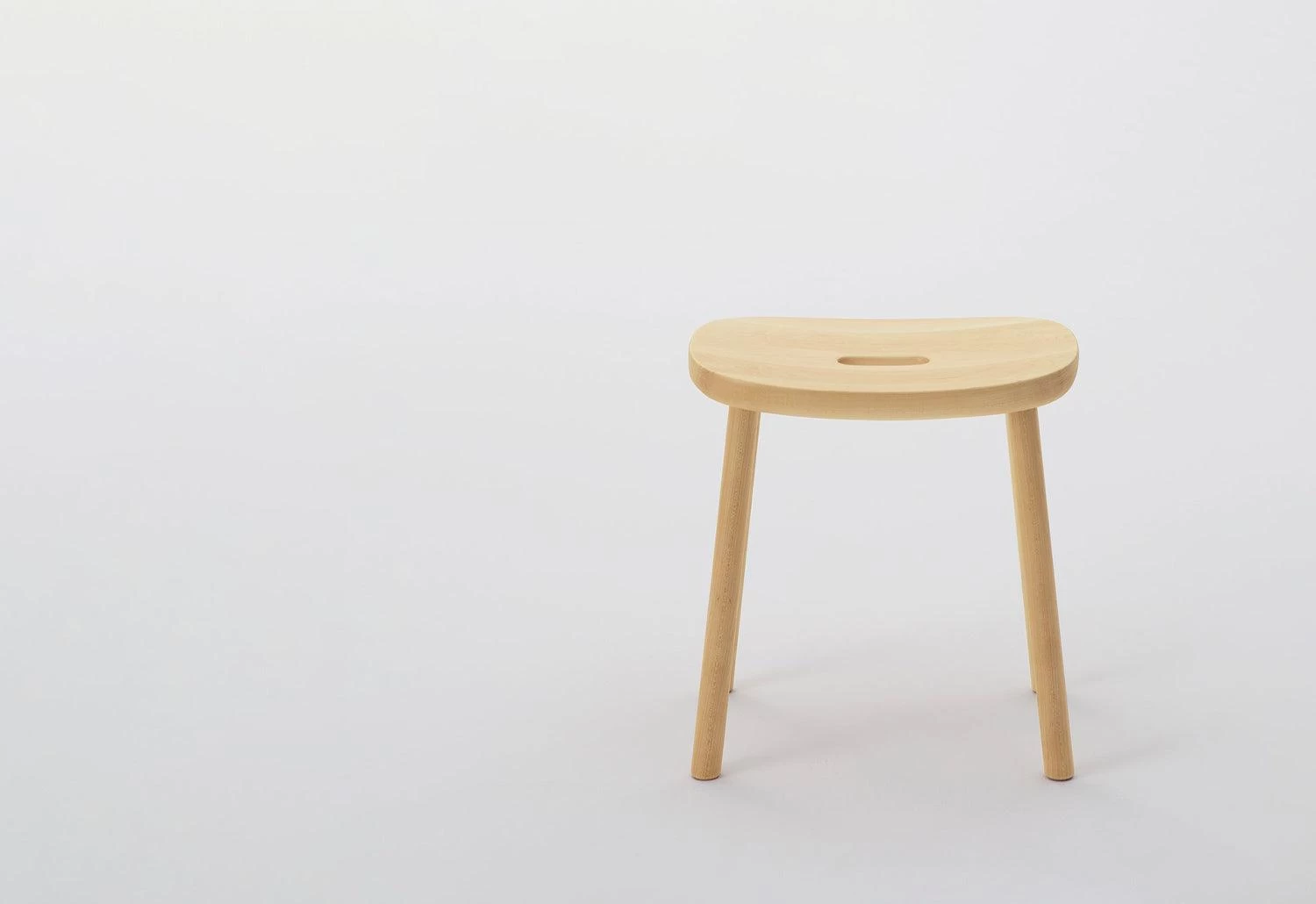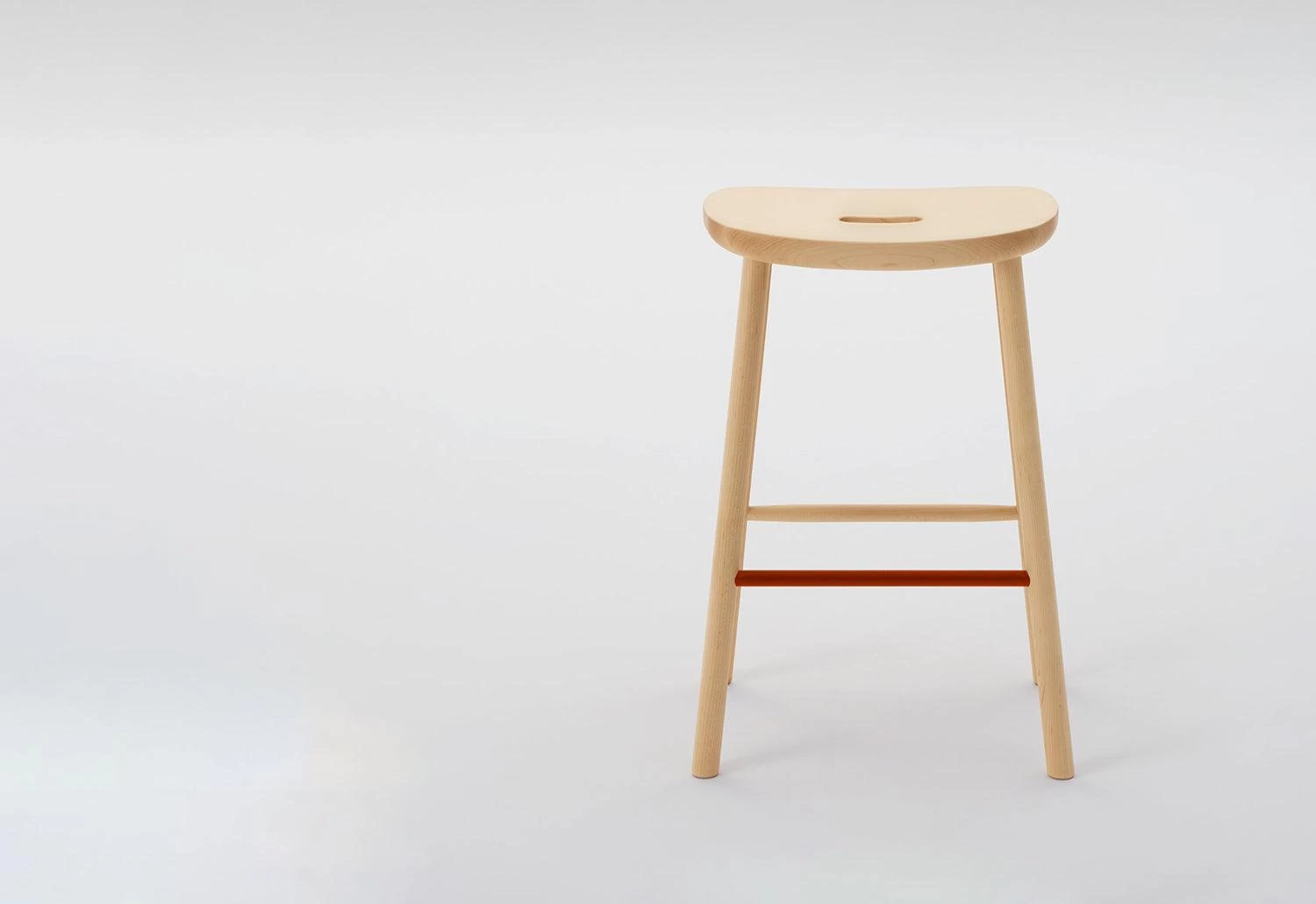 The O stool makes optimum use of 3D wood machining technology and is shaped from solid maple/ash wood with a clear urethane varnish. The seat has a gently concave profile with an oblong slot to assist with carrying.