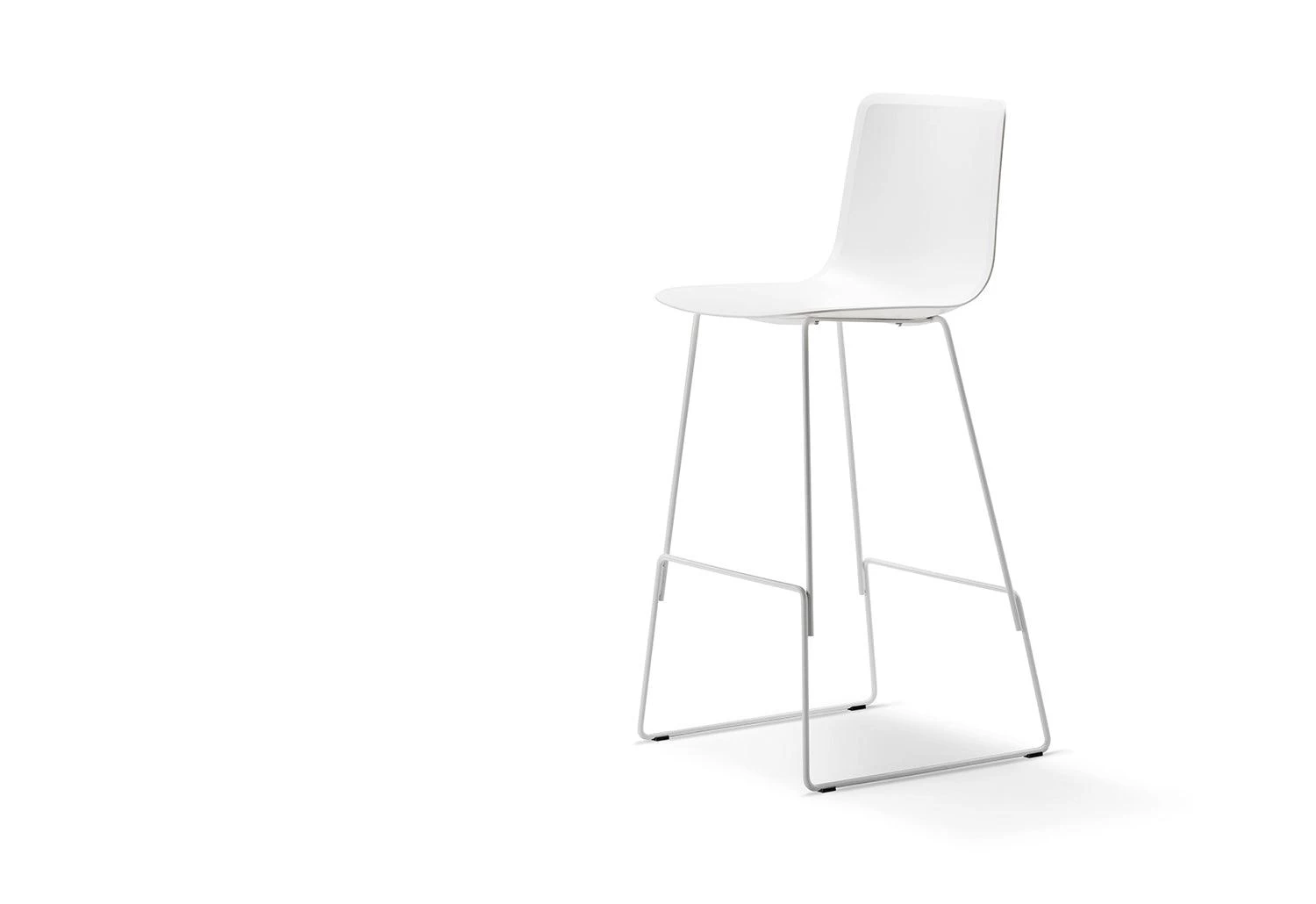 Versatile shell bar stool in polypropylene with a range of steel frames and upholstery. A silky textured surface and bevelled edge add a visual lightness and detailed craftmanship to this industrial standard.