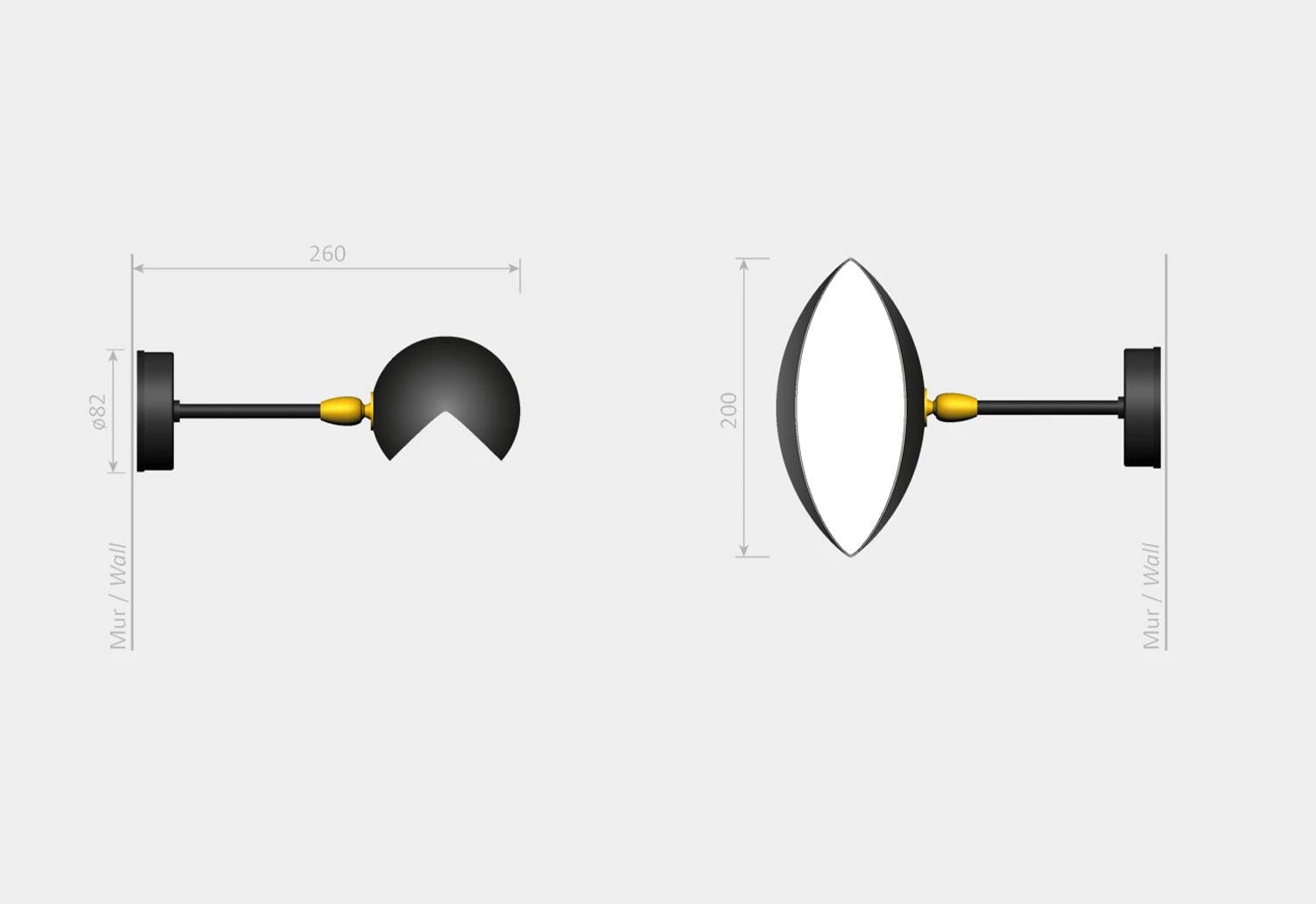 Petite applique Œil or Eye lamp features an eye-shaped shade that can articulate in a 270° rotation and 50° inclination, attached to the arm with a classic Serge Mouille brass joint.