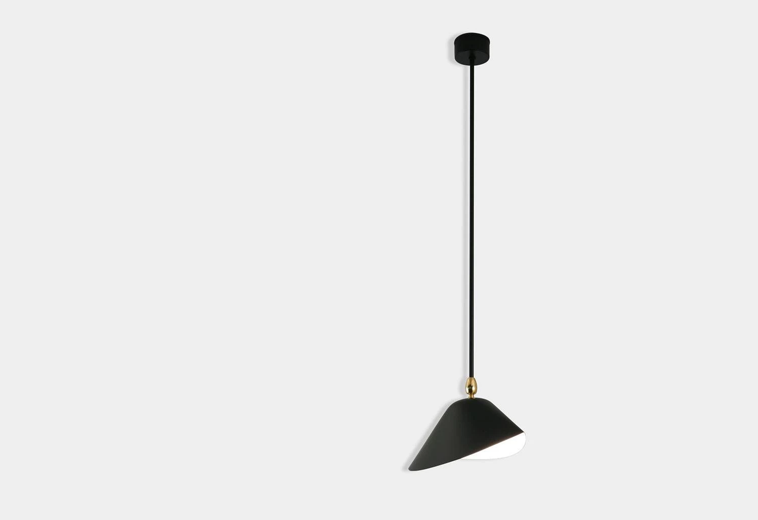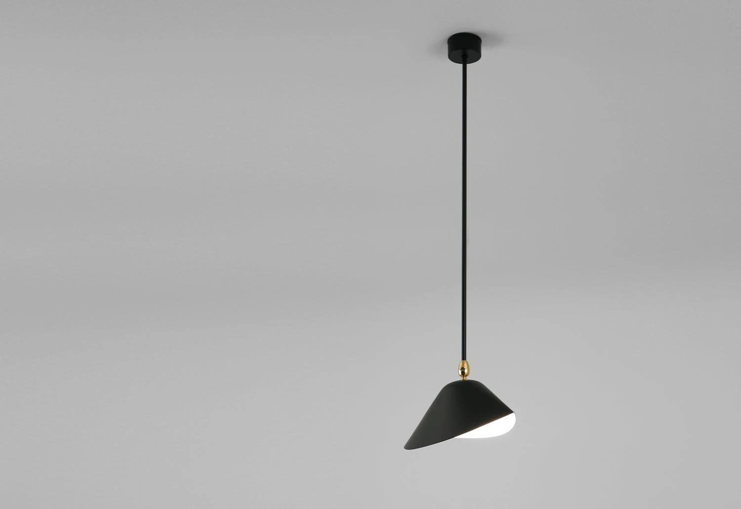 Plafonnier Pivotants (ceiling lights) features Mouille’s signature use of refined lines, hardware and the brass swivel connector, joining the arm to the diffuser.