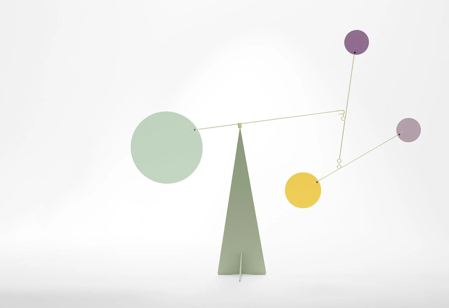 This mobile has a minimalist design and a pastel colour palette. The compact size makes this mobile suitable for a desk or shelf and its beauty is enhanced by its subtle movement, enabled by precise forms and balance.