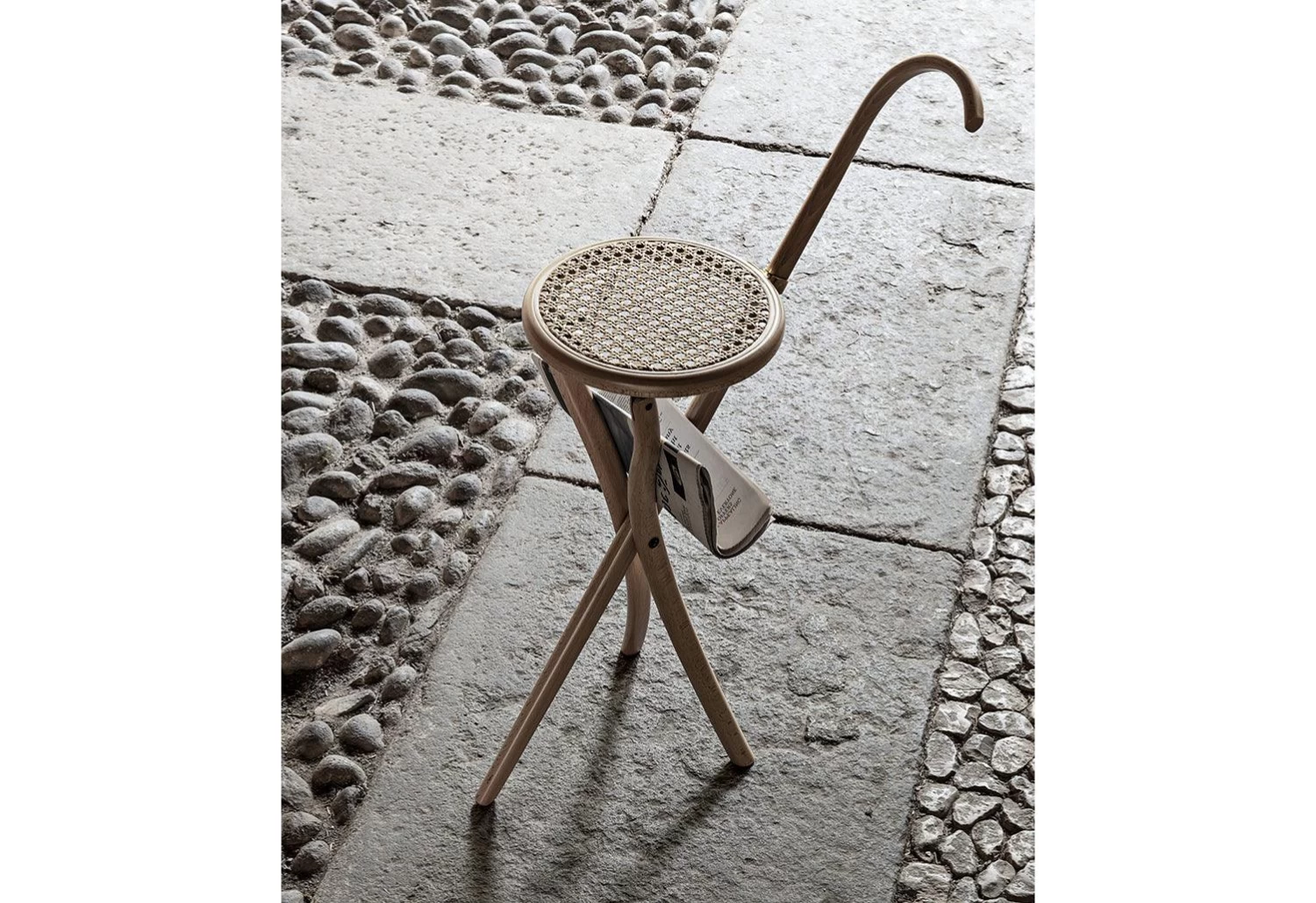 A historical re-edition with all the charm of past times. A walking stick, and folding stool made from beautiful bent beech wood and a woven cane seat connecting the three curved legs. The swan’s neck handle also provides a comfortable backrest.