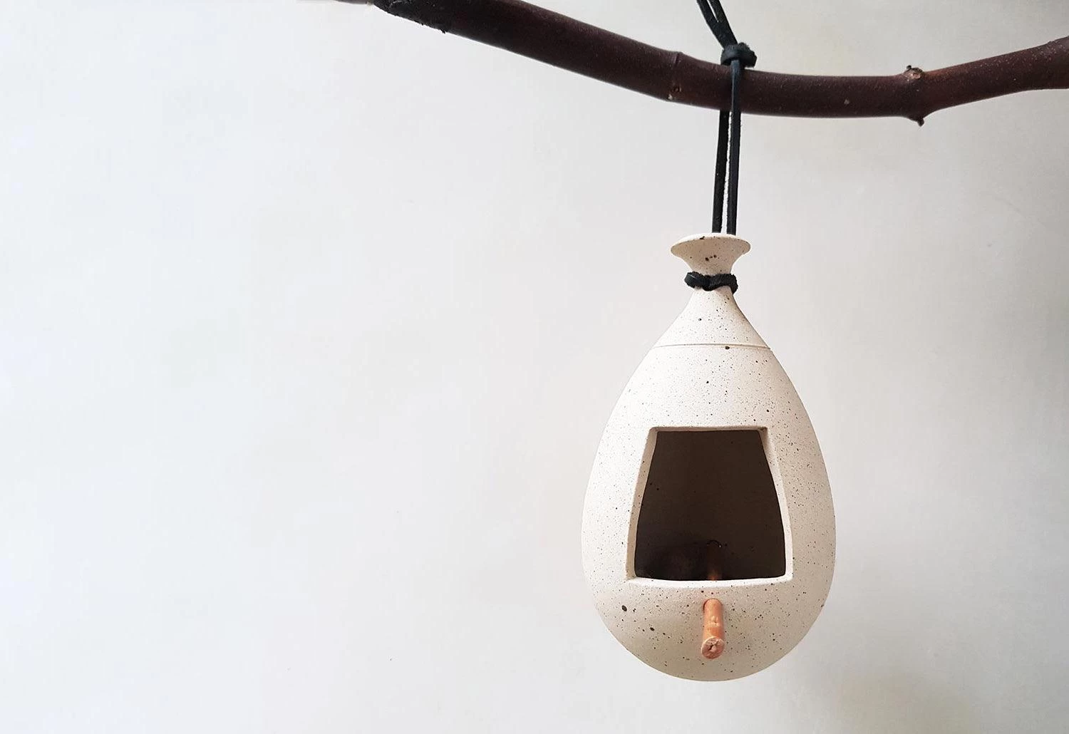 It has been fired to stoneware temperature and is completely frost proof. The design is complete with a perch made from Buff willow grown in Somerset and a tie in leather cord.