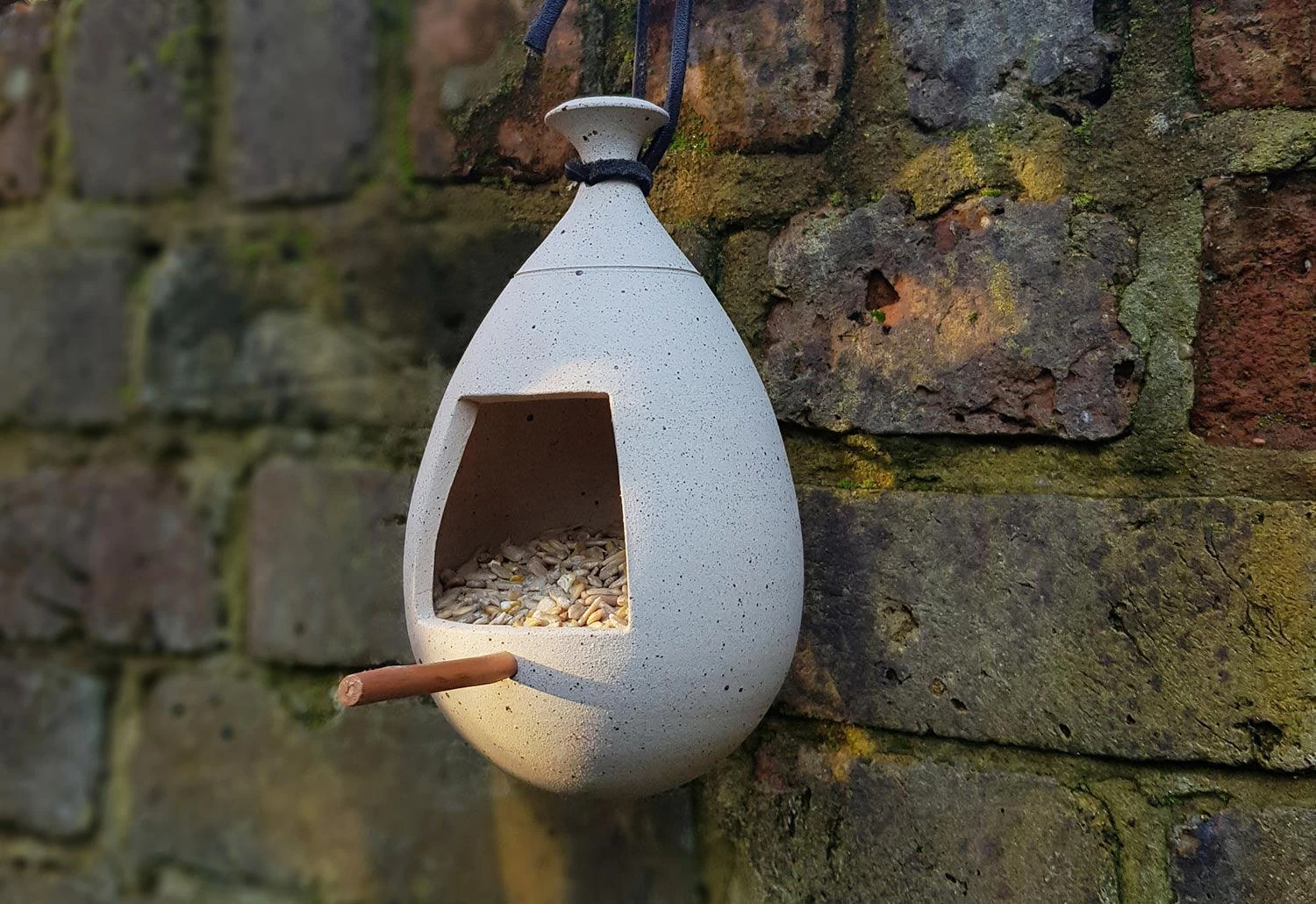 Pat O’Leary’s birdfeeder combines a sculptural form with function. The feeder is hand-thrown as a single piece using Staffordshire stoneware clay mixed with a small amount of volcanic dust to create the ‘speckled egg’ finish.