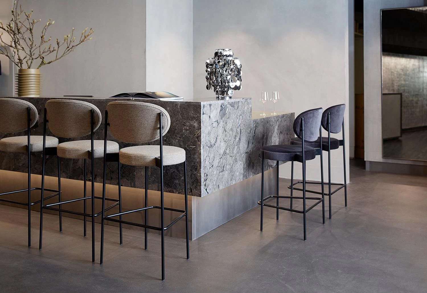 Designed in 1967, the Series 430 bar stool has a stylish and contemporary design. Verner Panton wanted to design a bar stool that was comfortable, applying a fully upholstered seat to a sleek frame with a solid footrest. The bar stool is inviting and ideal for both public and private interiors.
