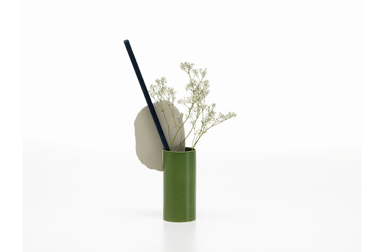 Each vessel features a cast cylinder combined with an assortment of abstract slabs and extruded bars which can be attached or placed inside to create a variety of arrangements.