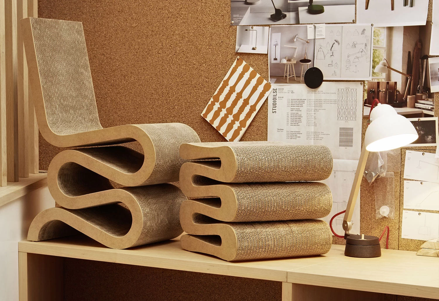 A staple in Frank Gehry’s office, corrugated cardboard was commonly used by the architect to create building models. One day, he decided to play with the material, cutting it into shapes with a hand saw and a pocket knife. He discovered that if he layered the cardboard repeatedly in alternate directions, he could create sturdy and fluid forms from the everyday shipping material.
