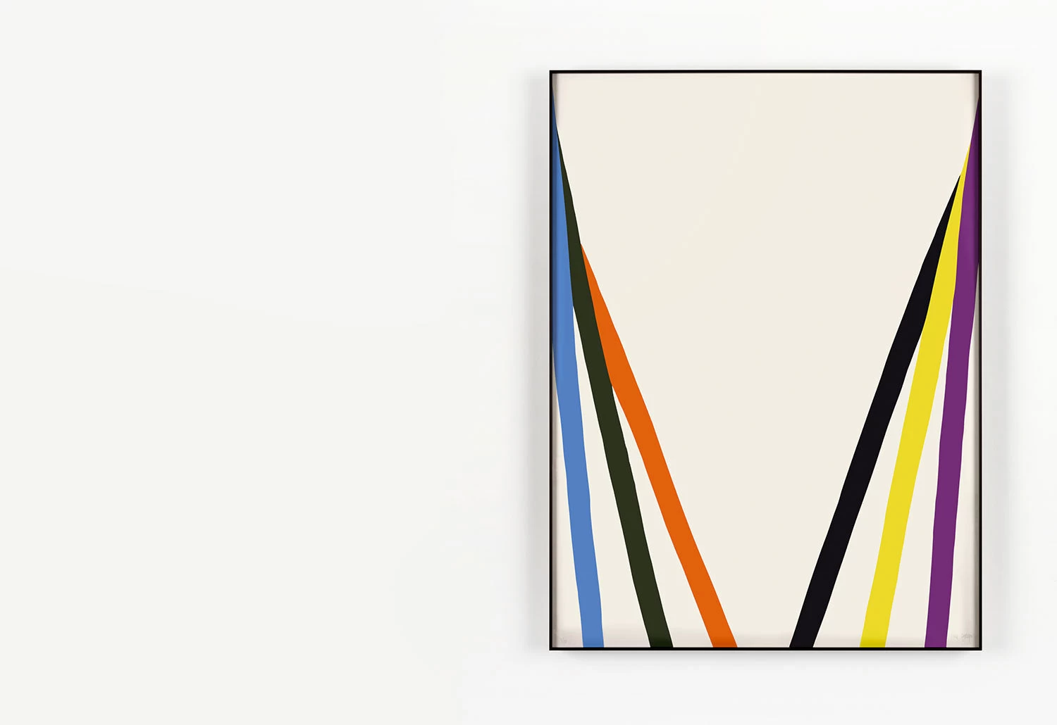 Ypsilion could be considered as one of his line drawings. The contemporary poster offers a striking, minimalist look by displaying six different coloured lines in different colours, which overlap at the top and disperse at the bottom. They sit atop an off-white vastness creating a strong contrast.